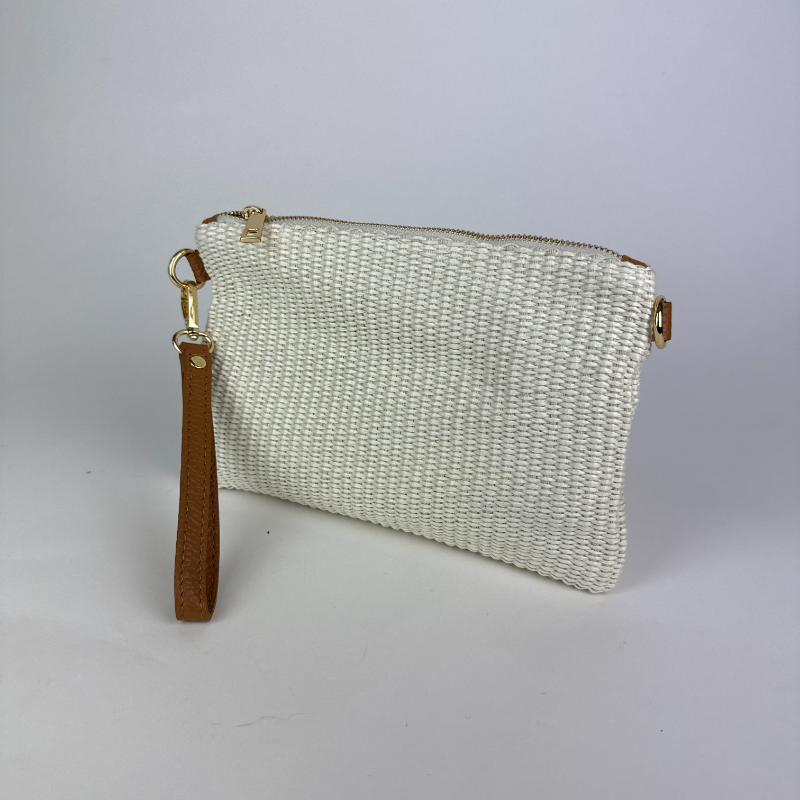 Rectangular straw clutch bag, with optional wristlet strap or cross body strap in tan leather