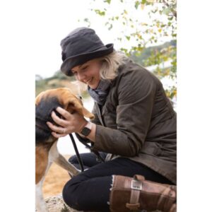 A small shape-able brimmed hat made from waxed cotton water resistant fabric and lined with a super soft fleece lining, style the brim up or down. Foldable design for taking out and about.