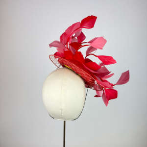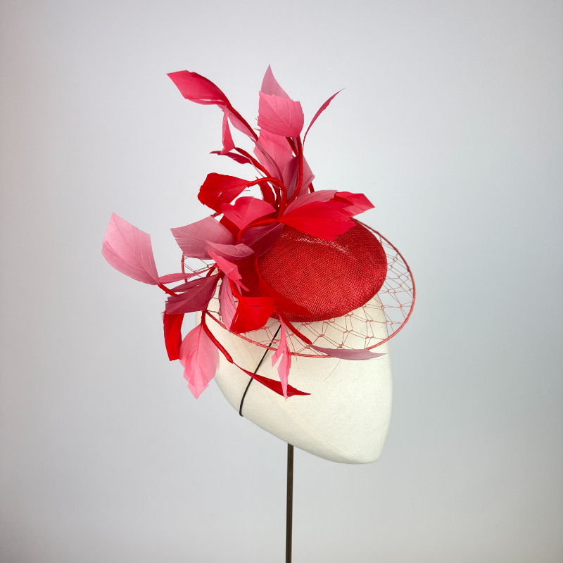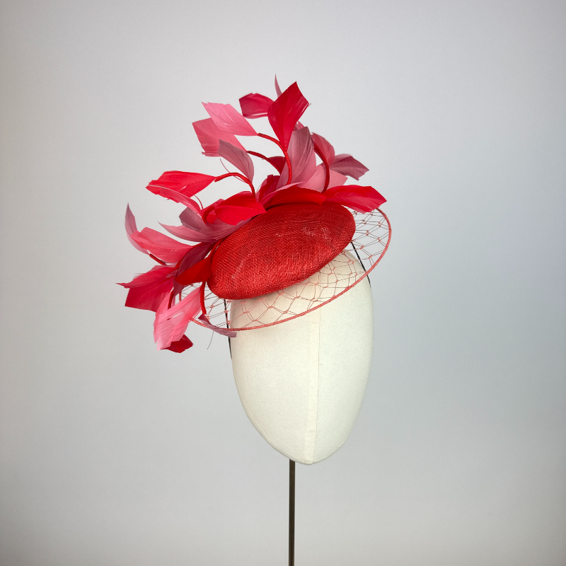 Small burnt coral sinamay beret edged with a veiled illusion brim, finished with feather vines in shades of red, pink and coral.