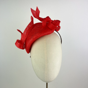 Bright coral orange low teardrop beret shape that curves around the face made from sinamay, finished with a twists and knots of sinamay ribbons.
