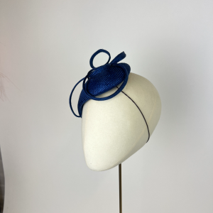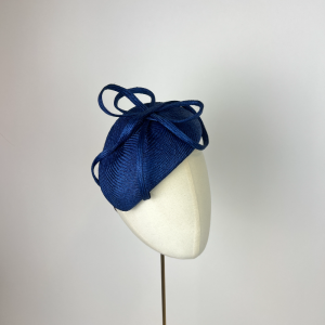 Deep royal blue parasisal straw teardrop beret finished with loops of royal parasisal ribbons