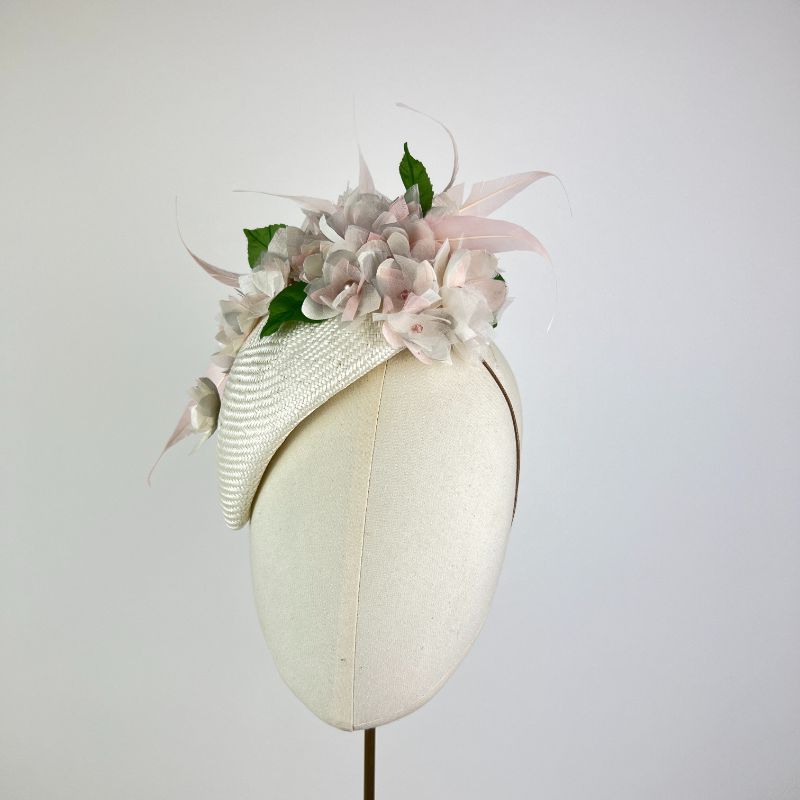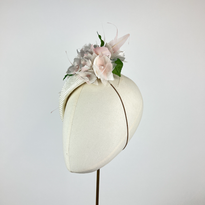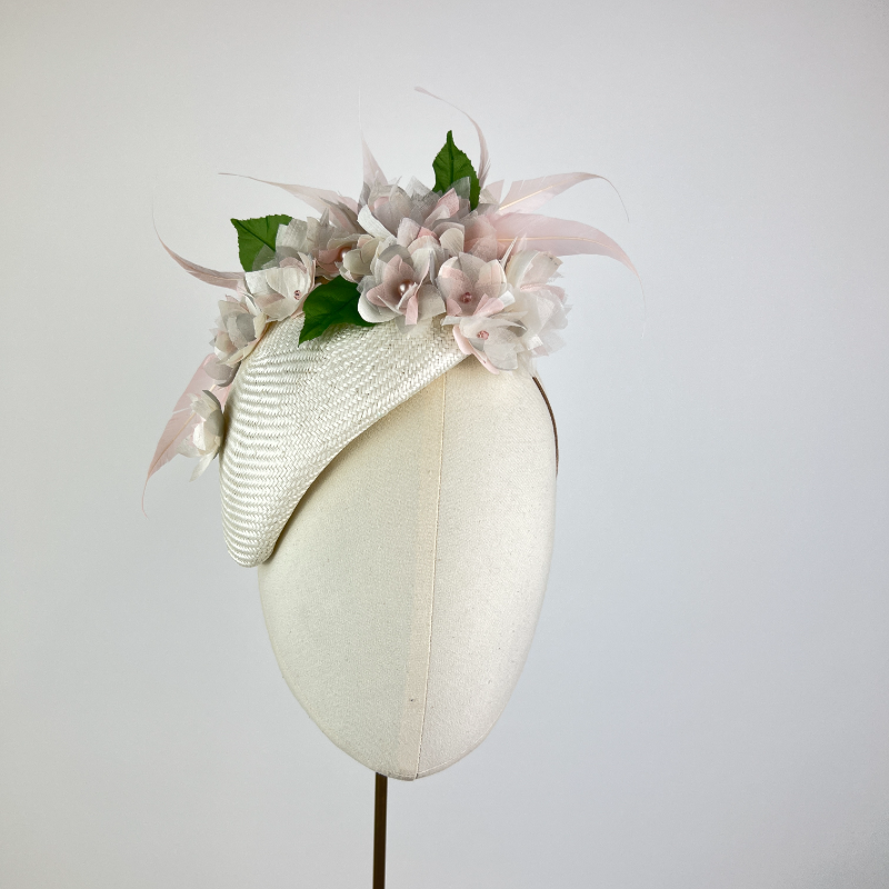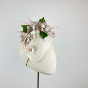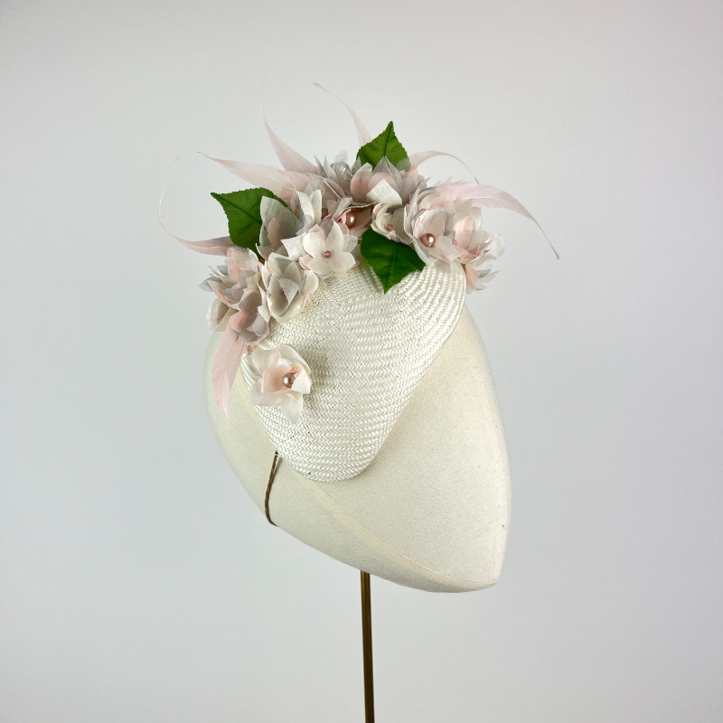 Small ivory teardrop beret made in parasisal straw, trimmed with small hand made flowers with Swarovski pearl and crystal centres, in ivory, blush pink and sheer silver grey tones. finished with green leaves and blush pink cur feathers. classic and elegant.