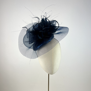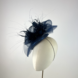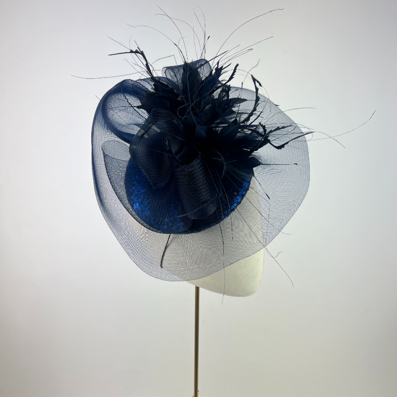 Small navy blue sequin beret covered with a sweep of navy blue crinoline and bustle, finished with navy blue feathers. The sequins add a subtle sheen to the design.