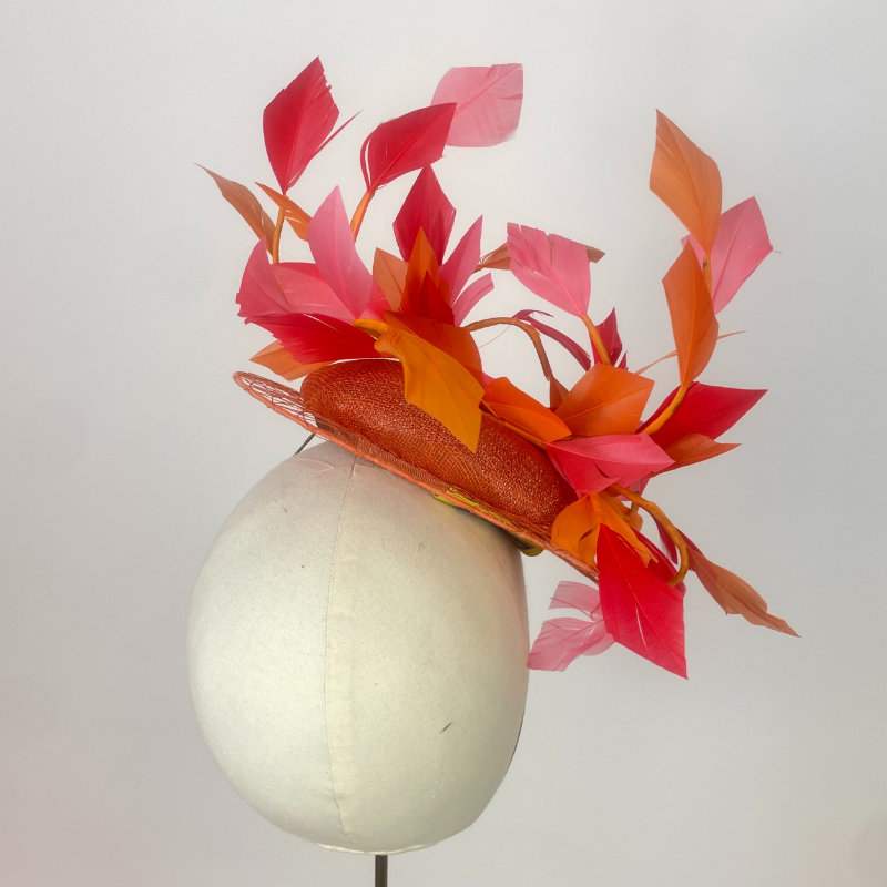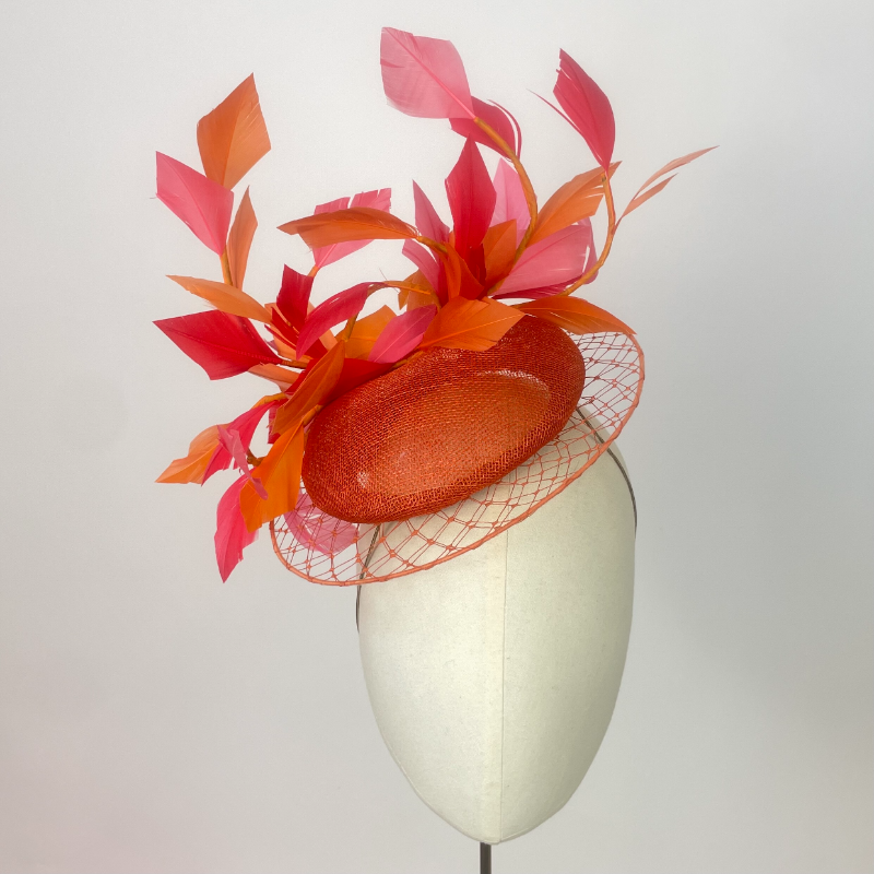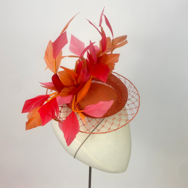 Small burnt orange sinamay beret edged with a veiled illusion brim, finished with feather vines in shades of orange, red and coral.