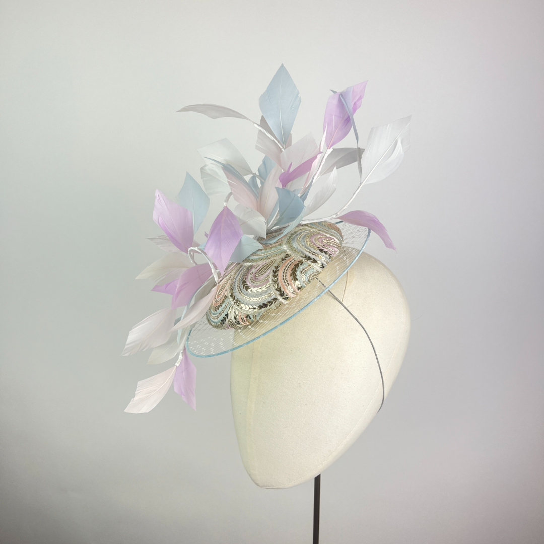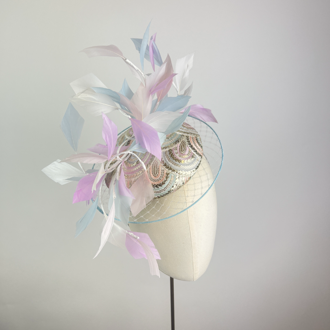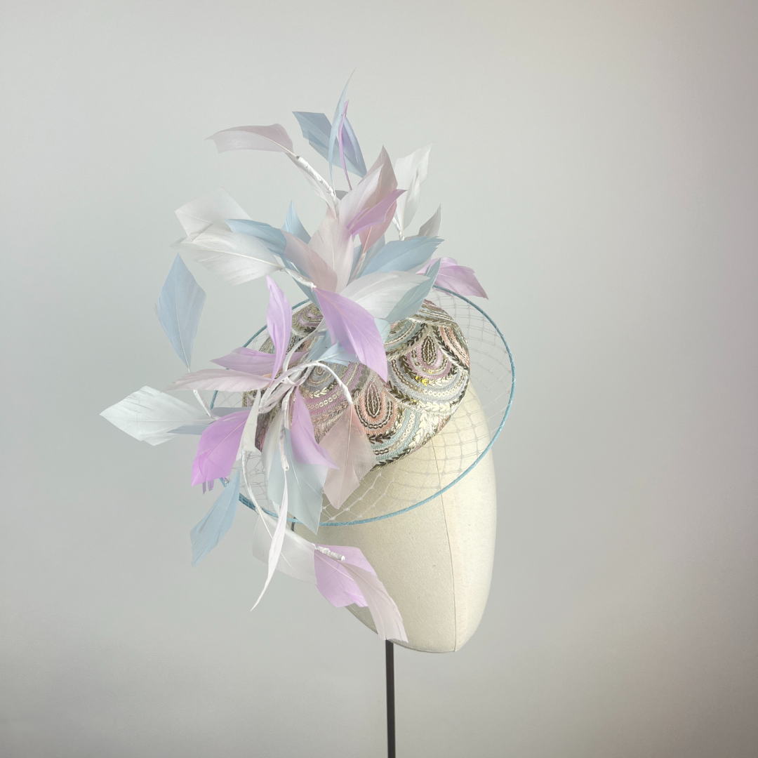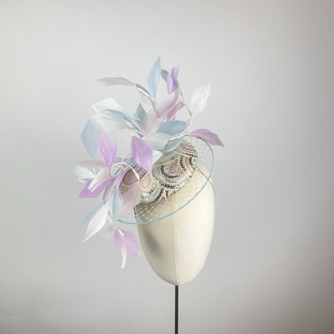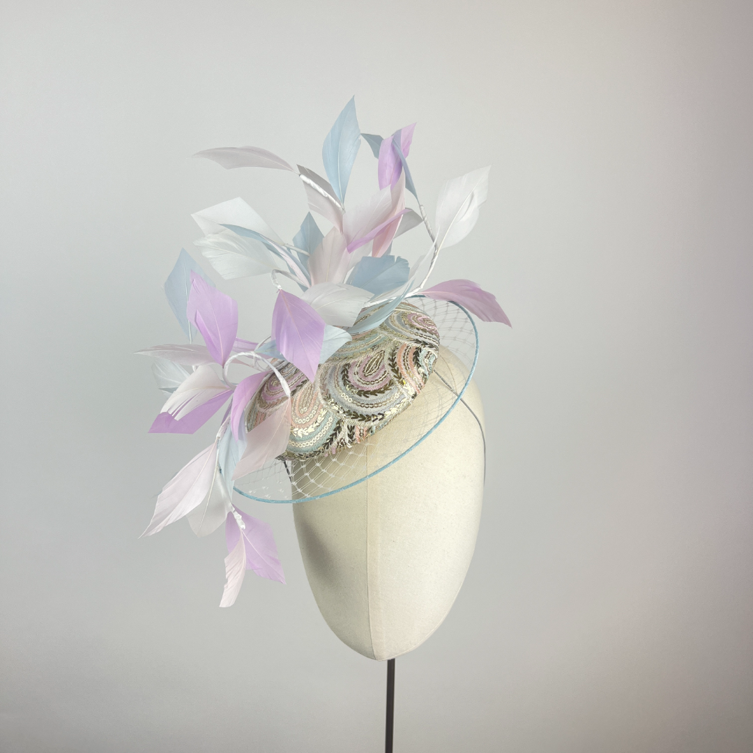 Small Ivory and silver sequin embroidered pastel rainbow beret edged with a veiled illusion brim, finished with feather vines, picking up the colours within the rainbow embroidery.