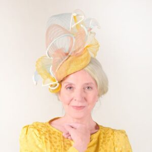 A Shallow wedge wave shaped beret headpiece in pastel yellow sinamay wrapped with dramatic pastel toned crinoline swirls edged in contrasting pastel velvet ribbons..