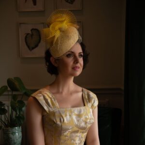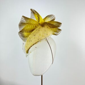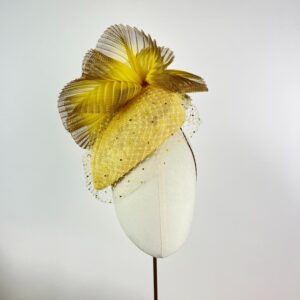 Yellow sinamay face hugging teardrop shaped beret covered with a delicate vintage yellow veil, scattered with gold and yellow Swarovski crystals, finished with a sweep of pleated crinoline dyed yellow with metallic gold ombre tips