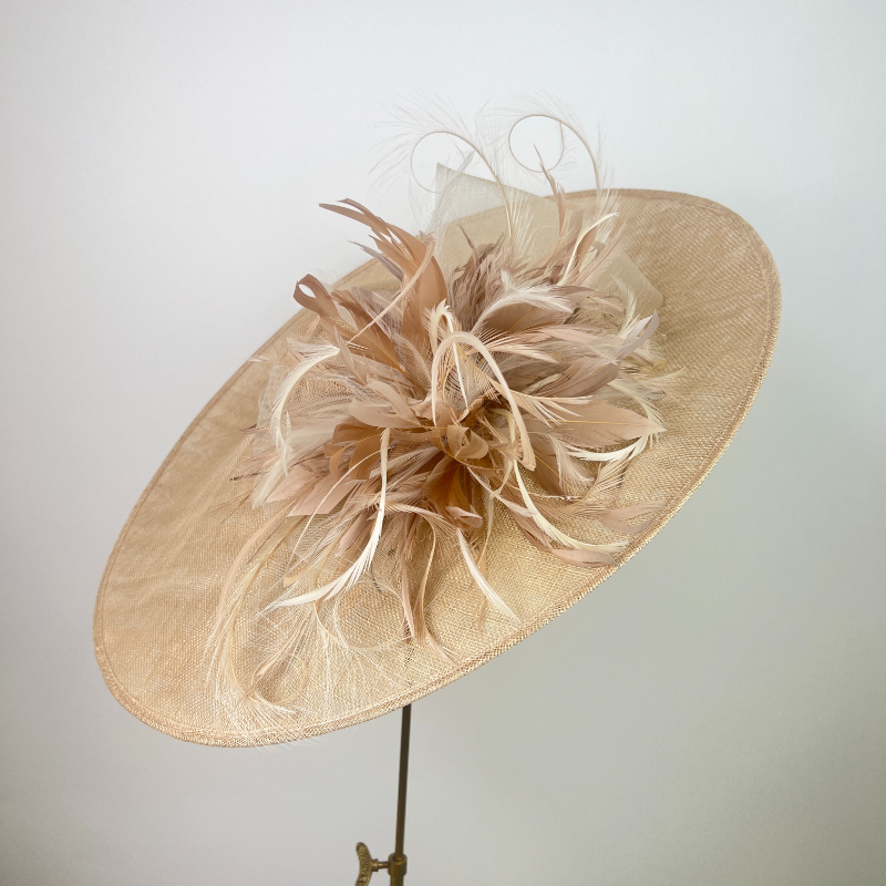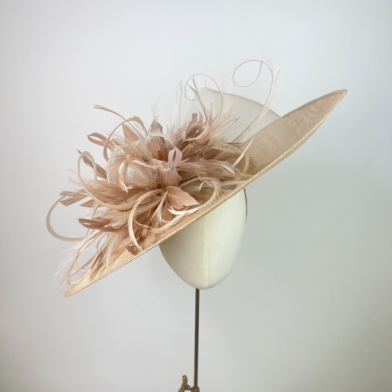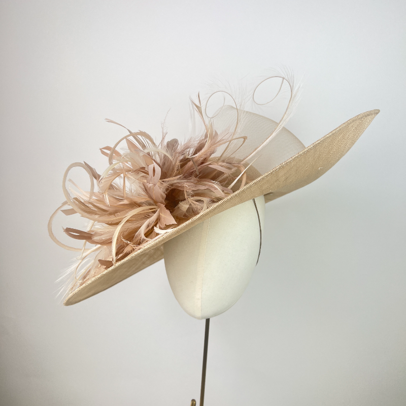 Large oval brimmed hat and shallow dome crown in champagne finished with pale champagne sheer ribbons, feather explosion in a warm natural tone and cream, with cream curled pheasant quills.