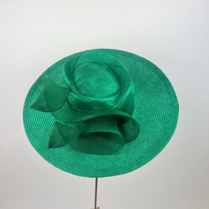 Parasisal straw boater hat in emerald green, with a rode shaped crown. Trimmed with a light twist of wired crinoline, floating off.