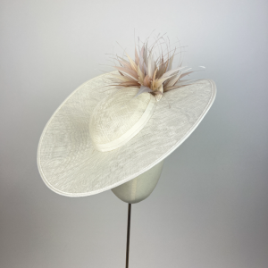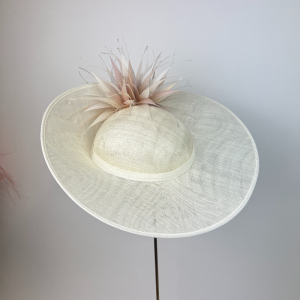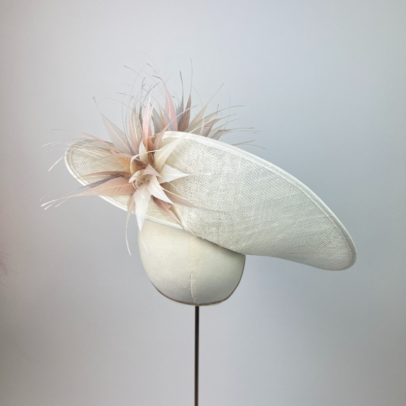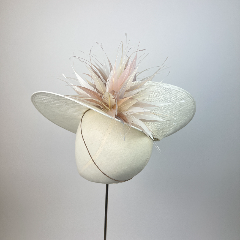 Ivory classic hat with a cut brim twisted around to give a more three dimensional shape with a ball of pointed cut feathers wrapping arounnd the twist, individually cut and placed feathers in Ivory, cream, nude pink, blush pink, taupe and almond tones.
