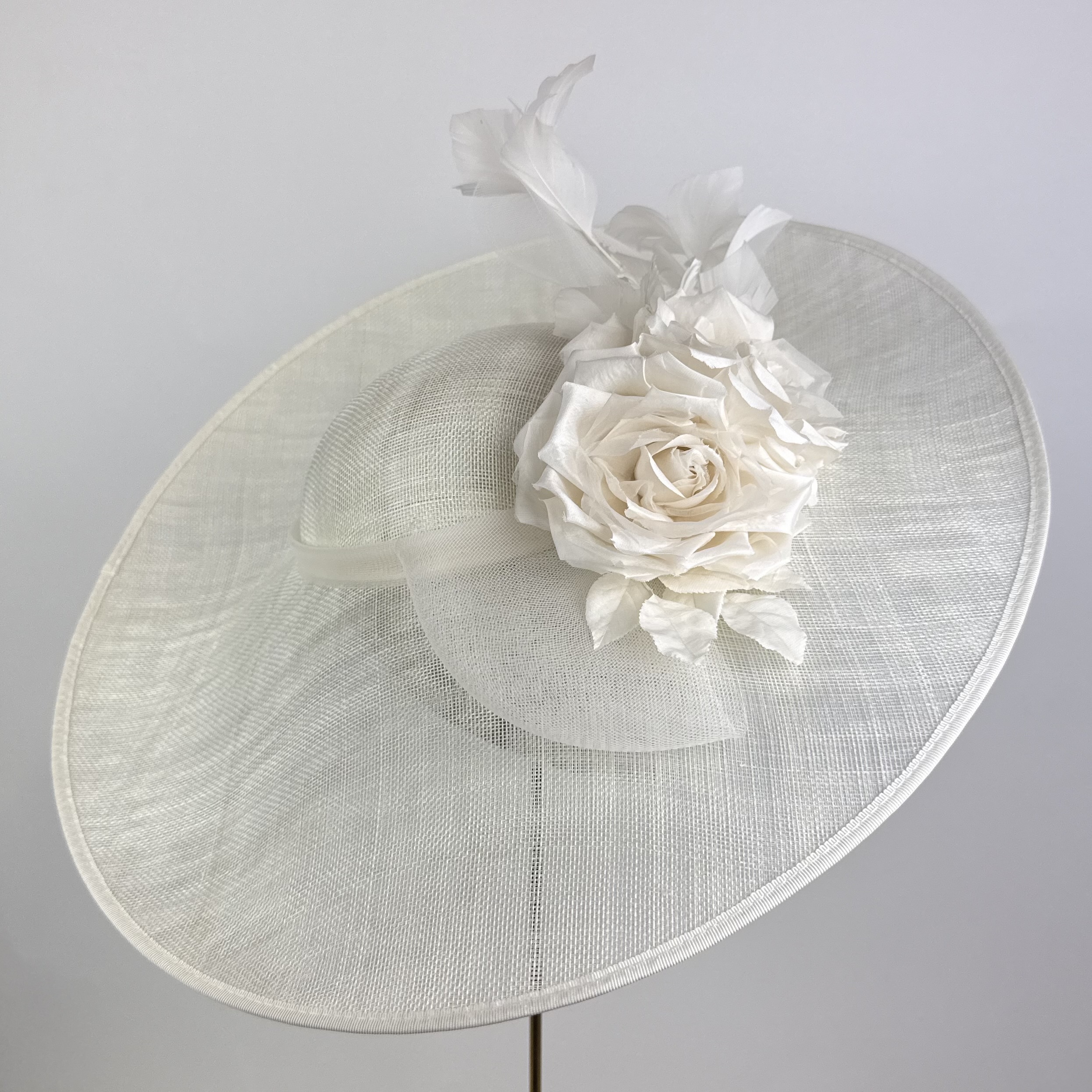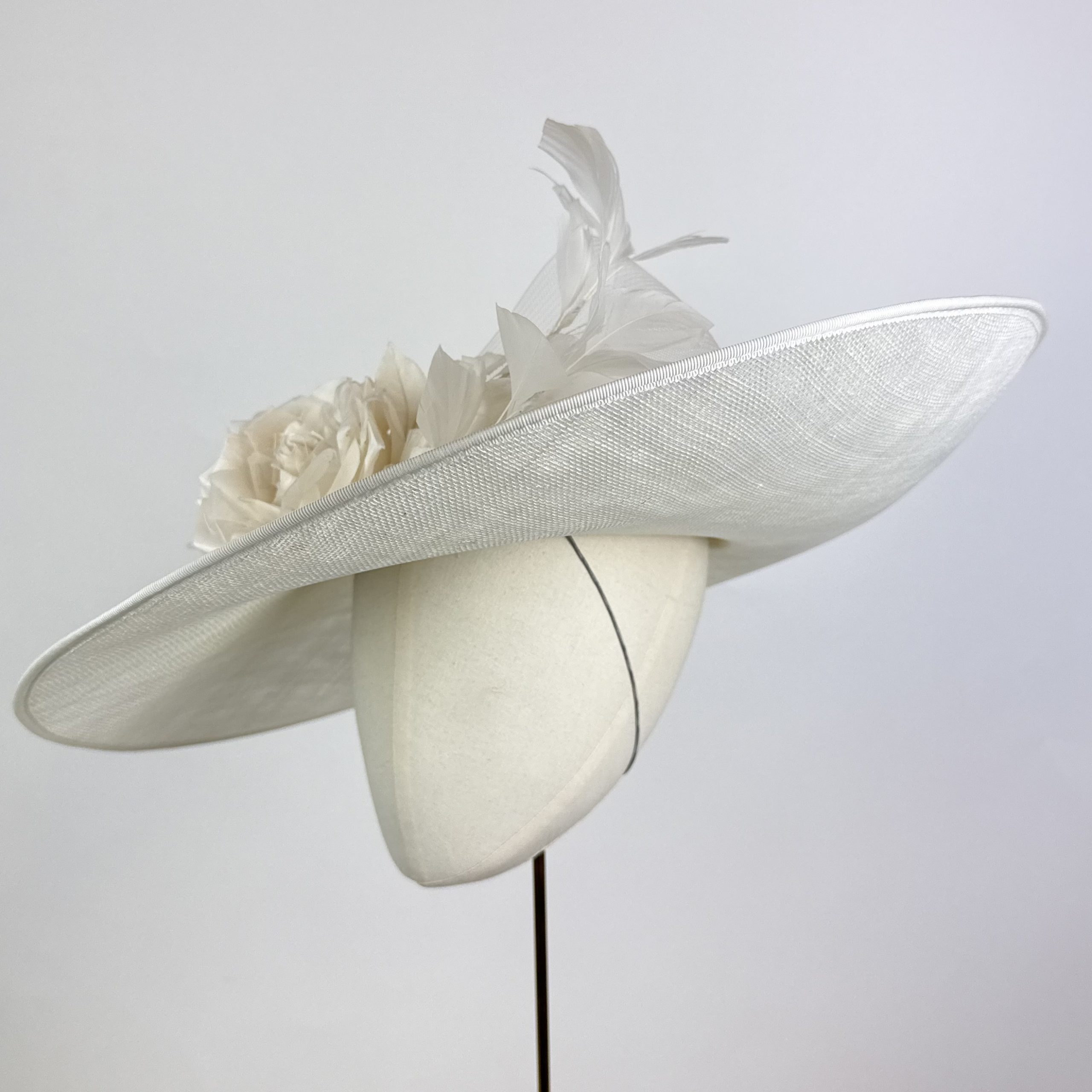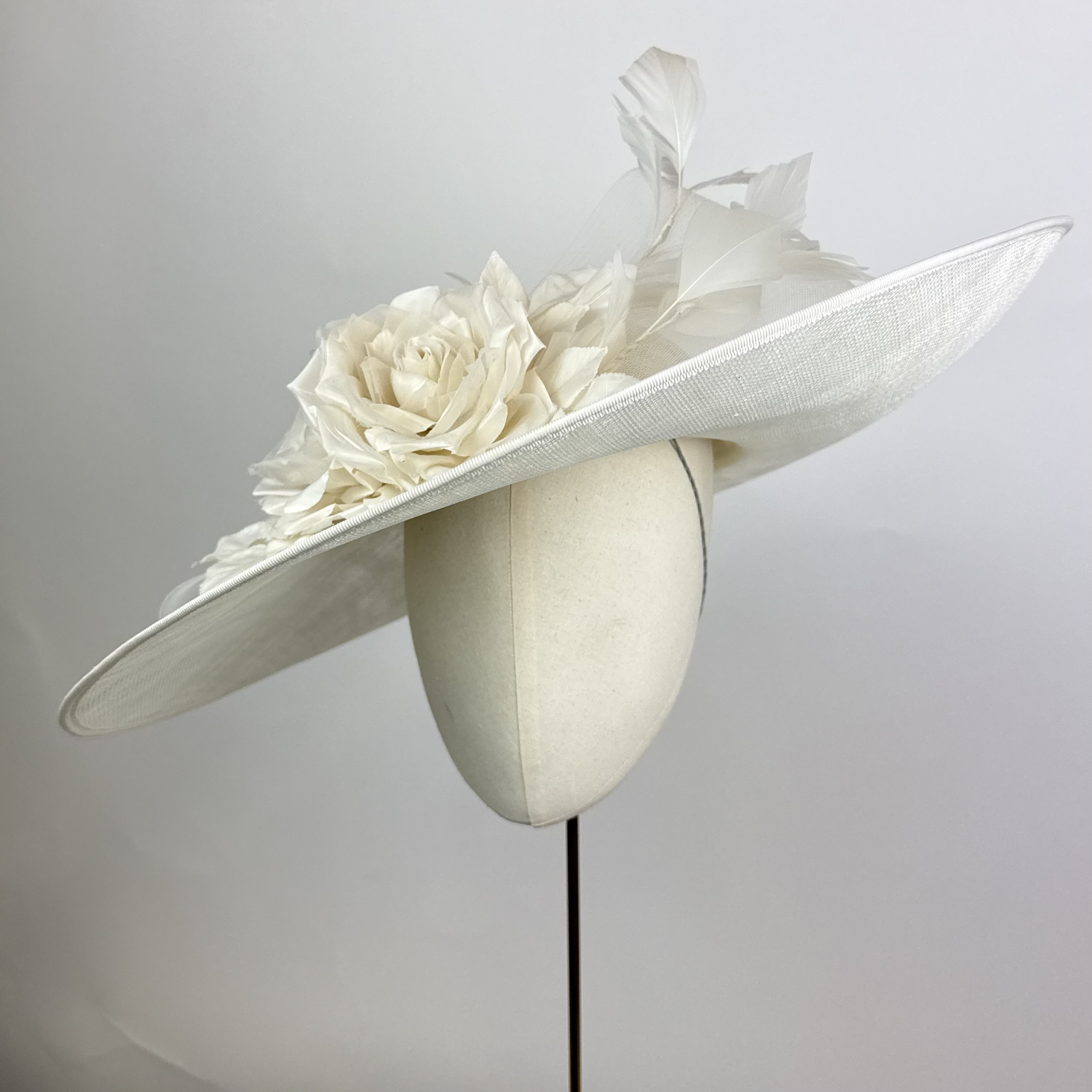 A wide brim oval shallow crowned hat with lift to the left side with a crinoline bow deatil to large ivory silk dupion roses adn a vine of ivory feathers.