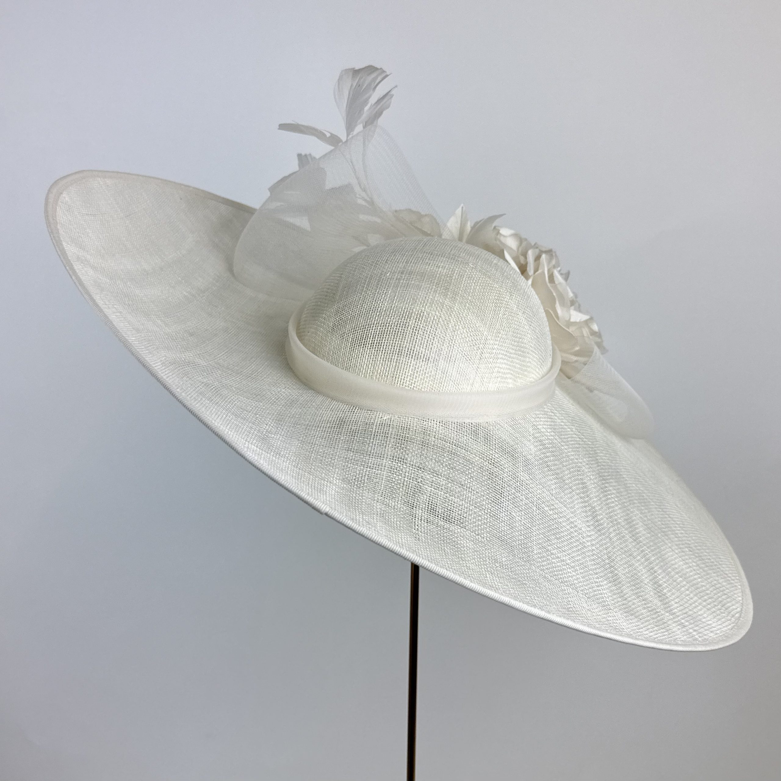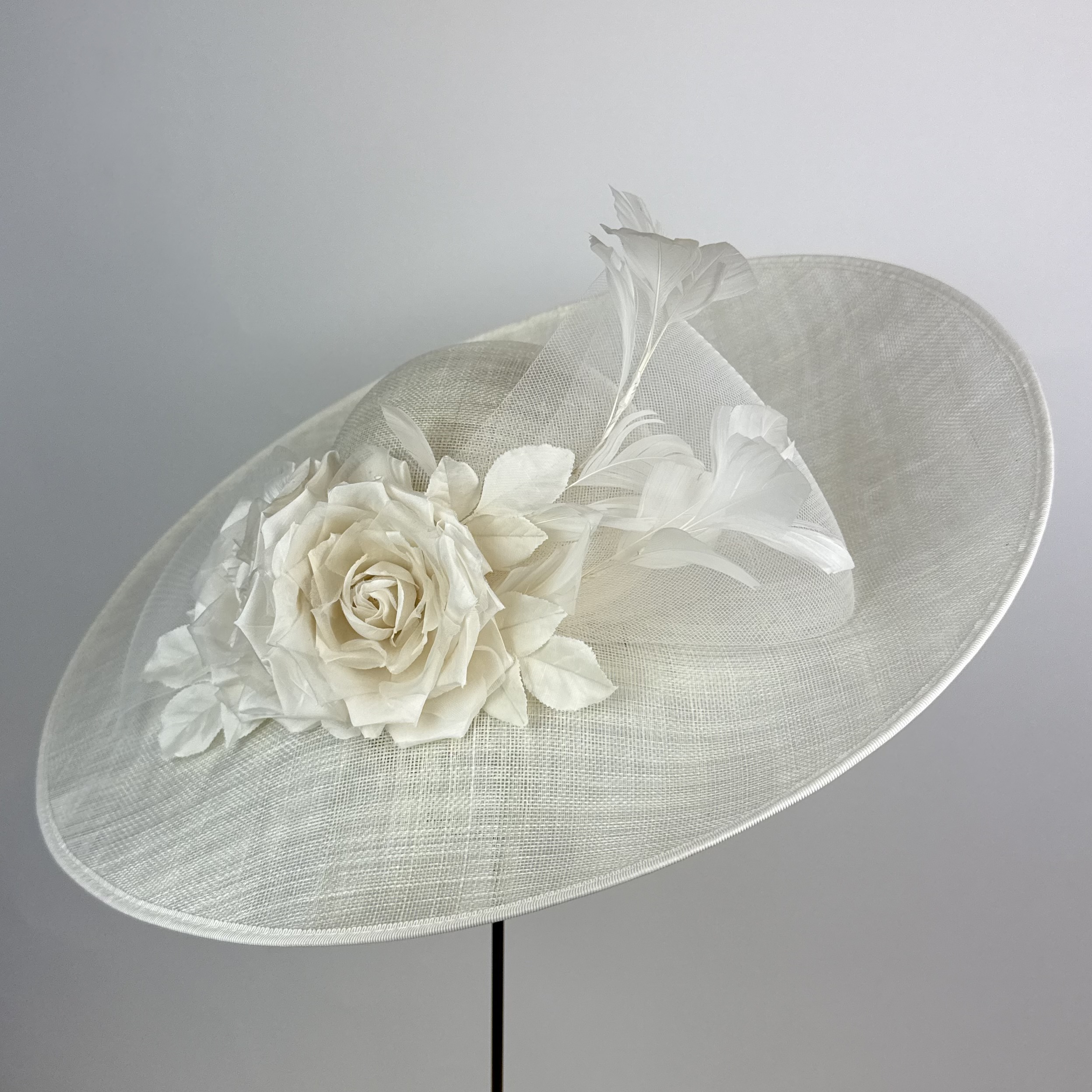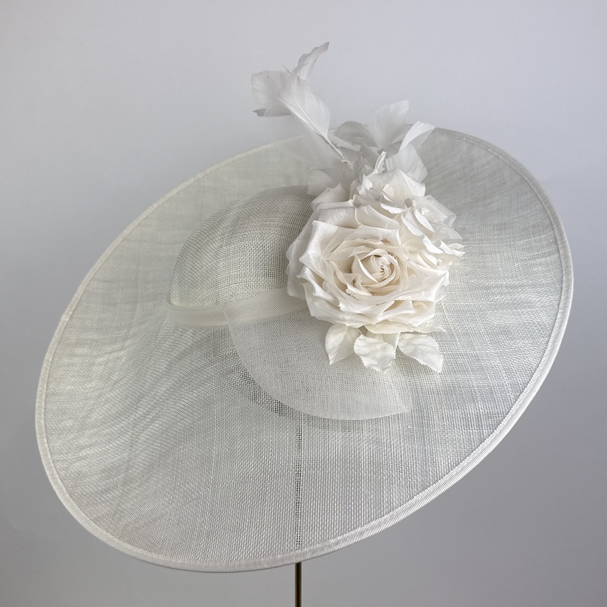 A wide brim oval shallow crowned hat with lift to the left side with a crinoline bow deatil to large ivory silk dupion roses adn a vine of ivory feathers.