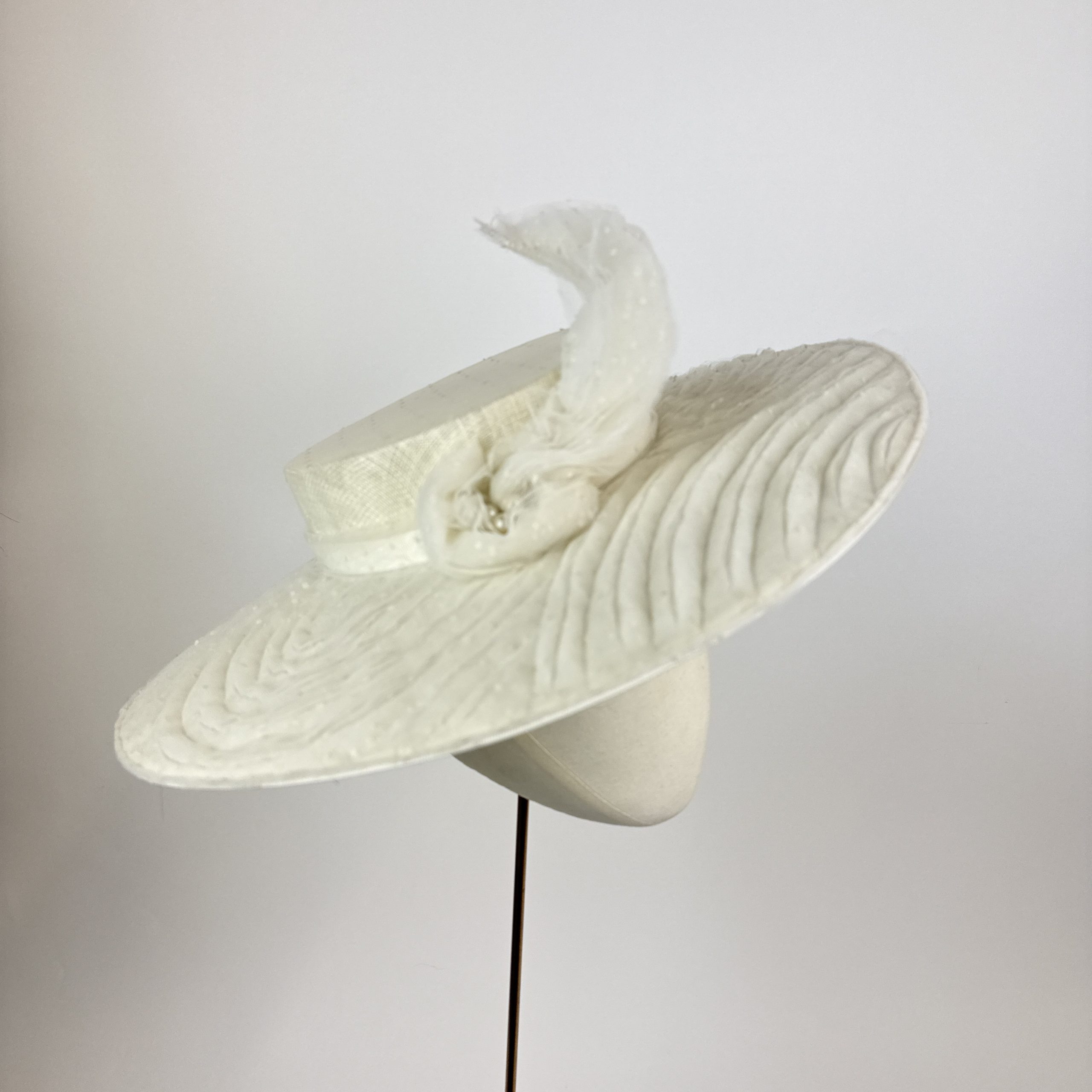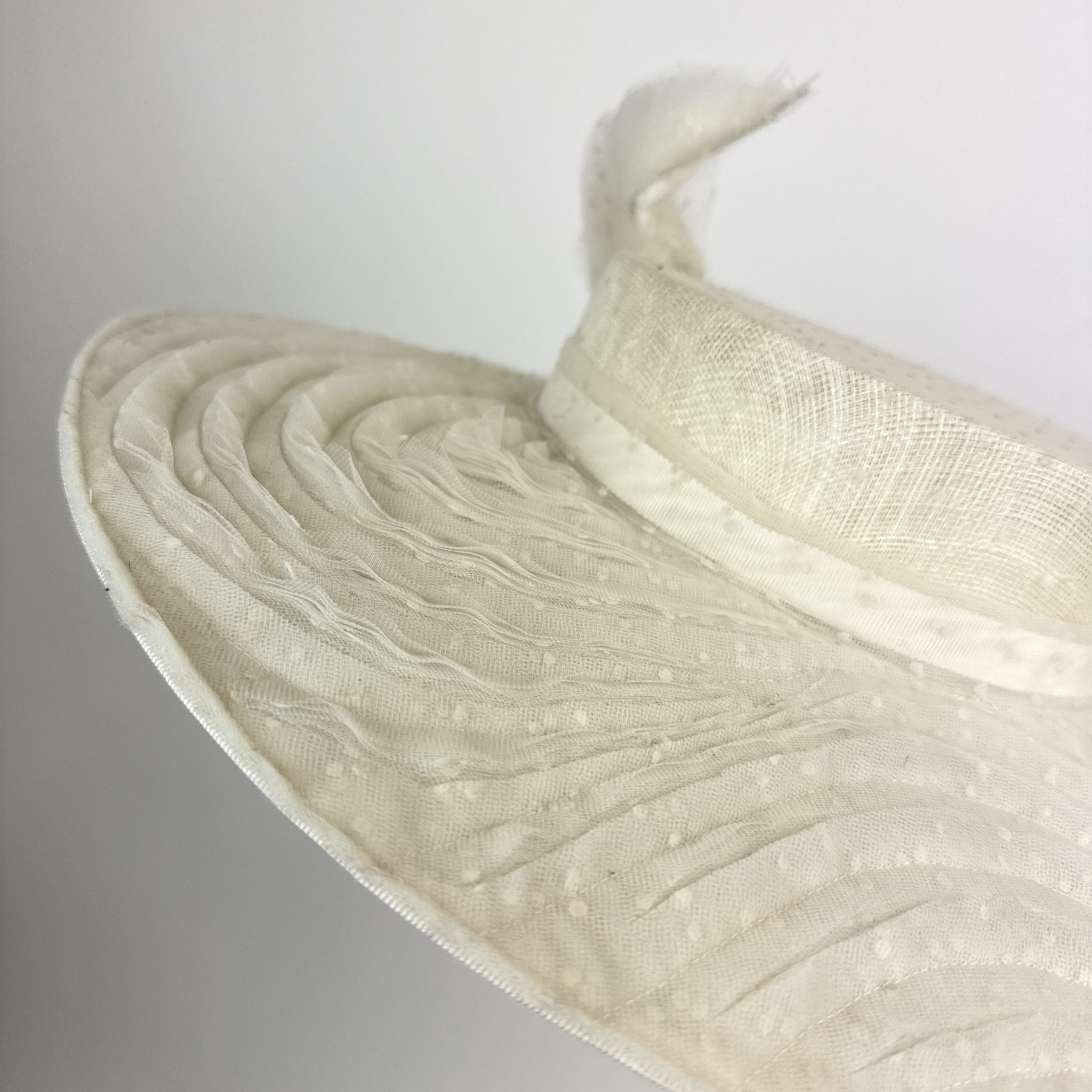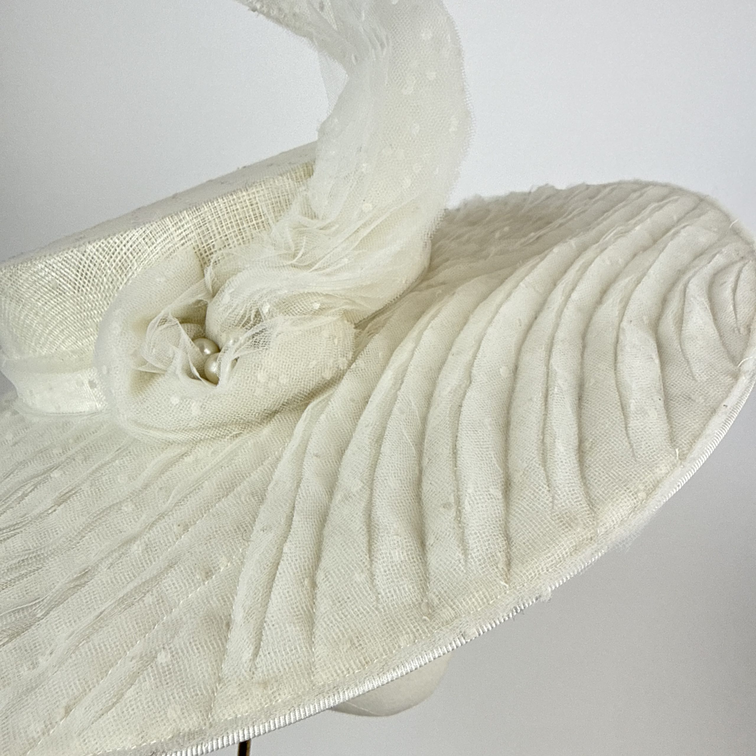 Ivory sinamay boater hat with deep layers of slashed spotted tulle in soft curved shapes, trimmed with a feather made from tulle and a pearl cluster. A unique textural finish.