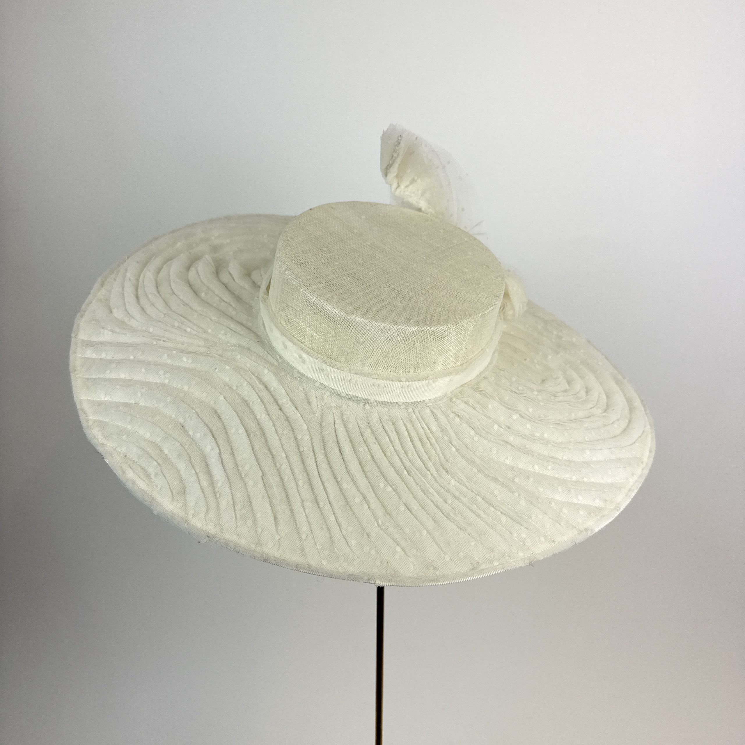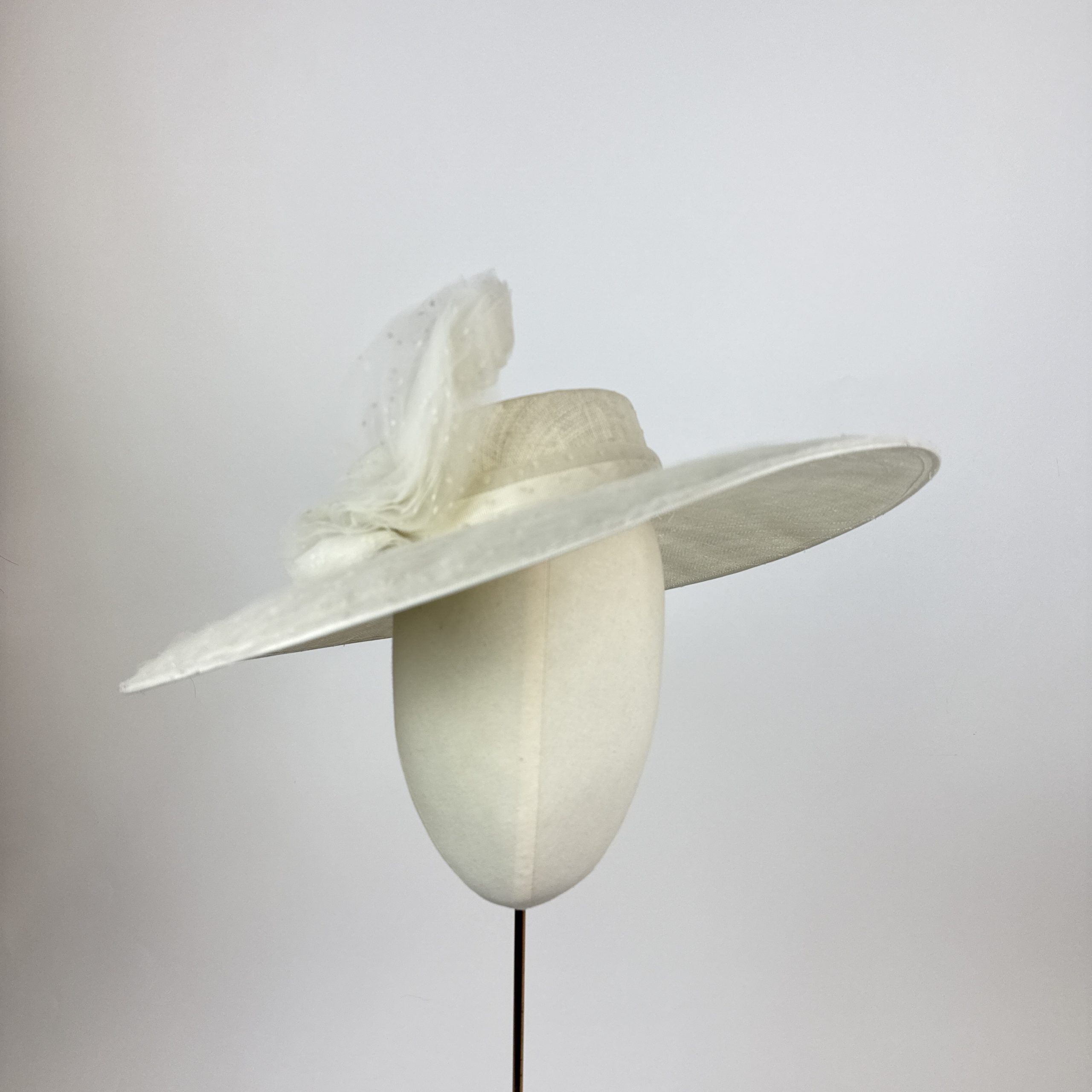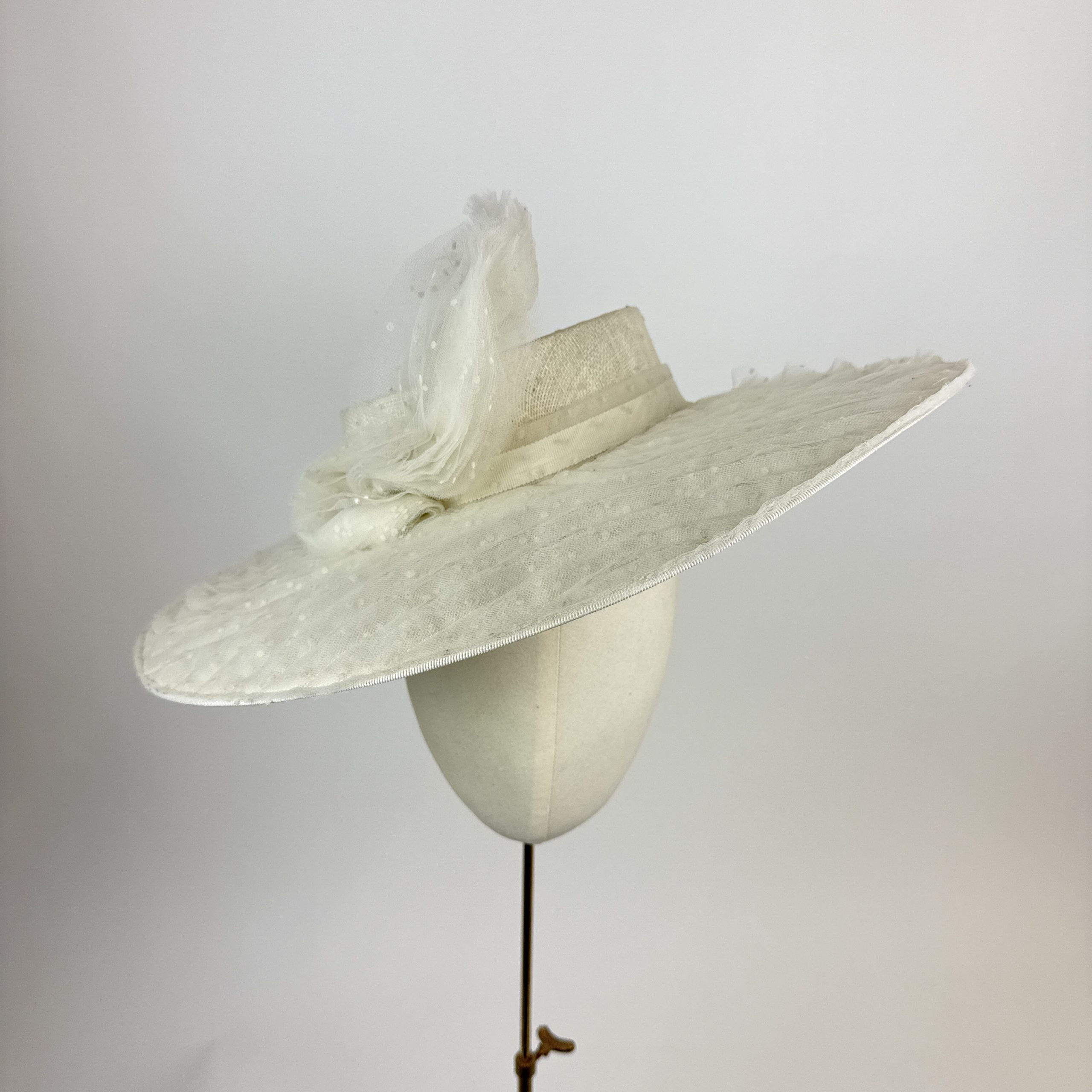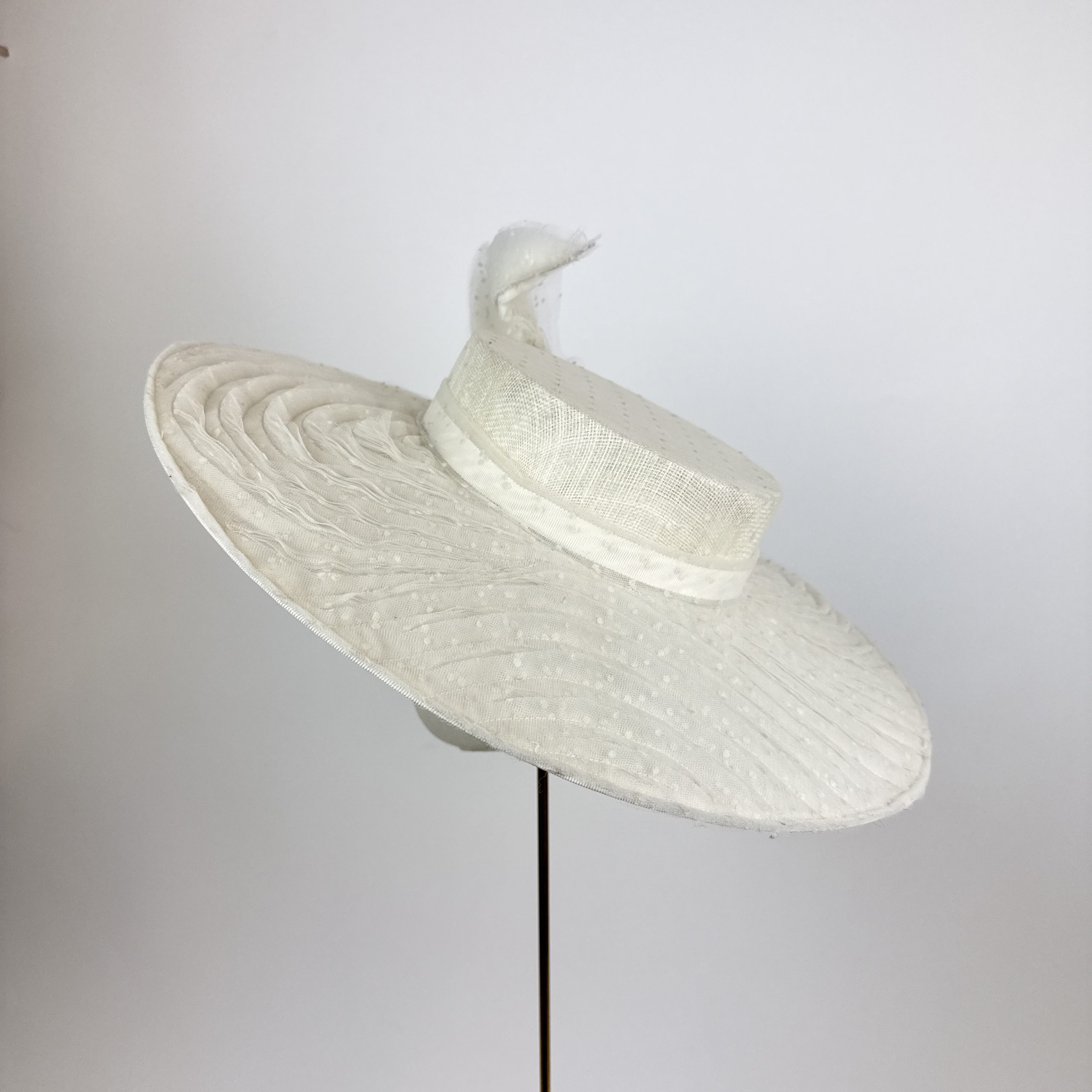 Ivory sinamay boater hat with deep layers of slashed spotted tulle in soft curved shapes, trimmed with a feather made from tulle and a pearl cluster. A unique textural finish.