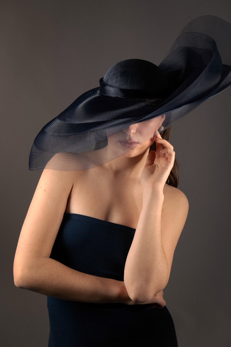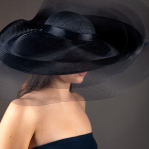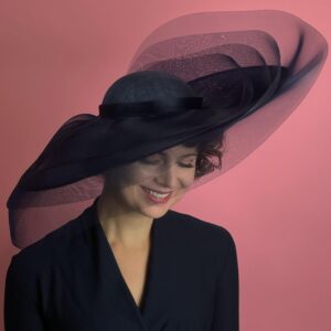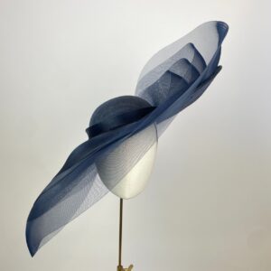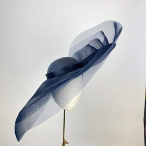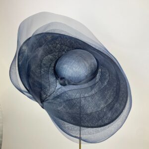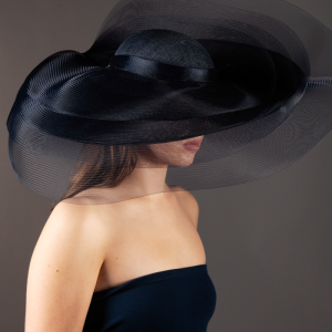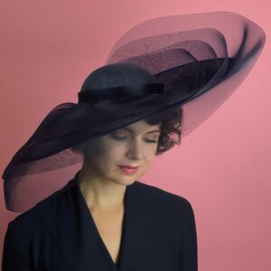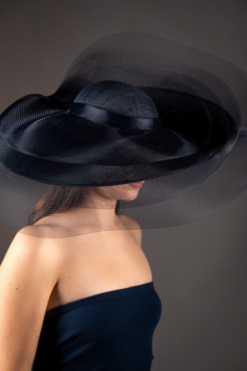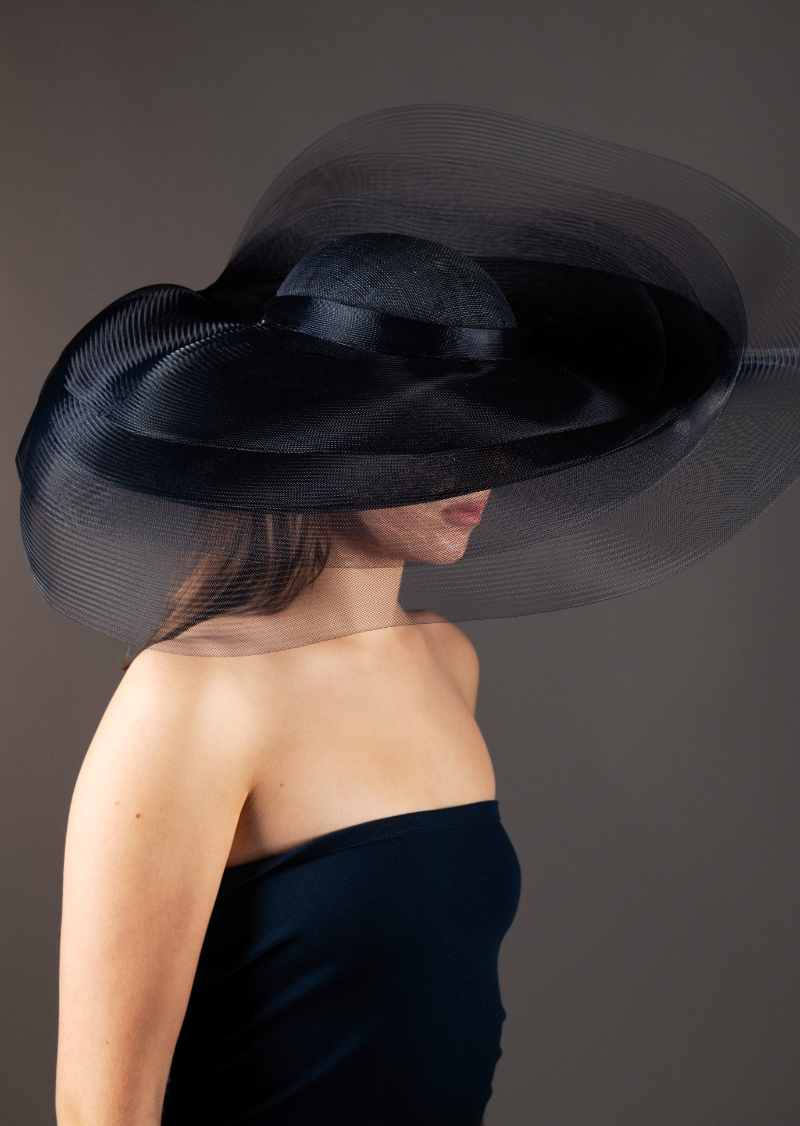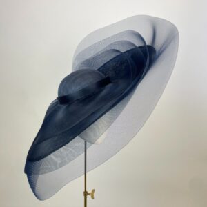 Large oval hat with upturn to one side and shallow dome crown, layered with levels of sheer navy crinoline, giving a dramatic yet whimsical effect