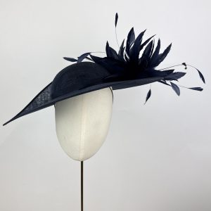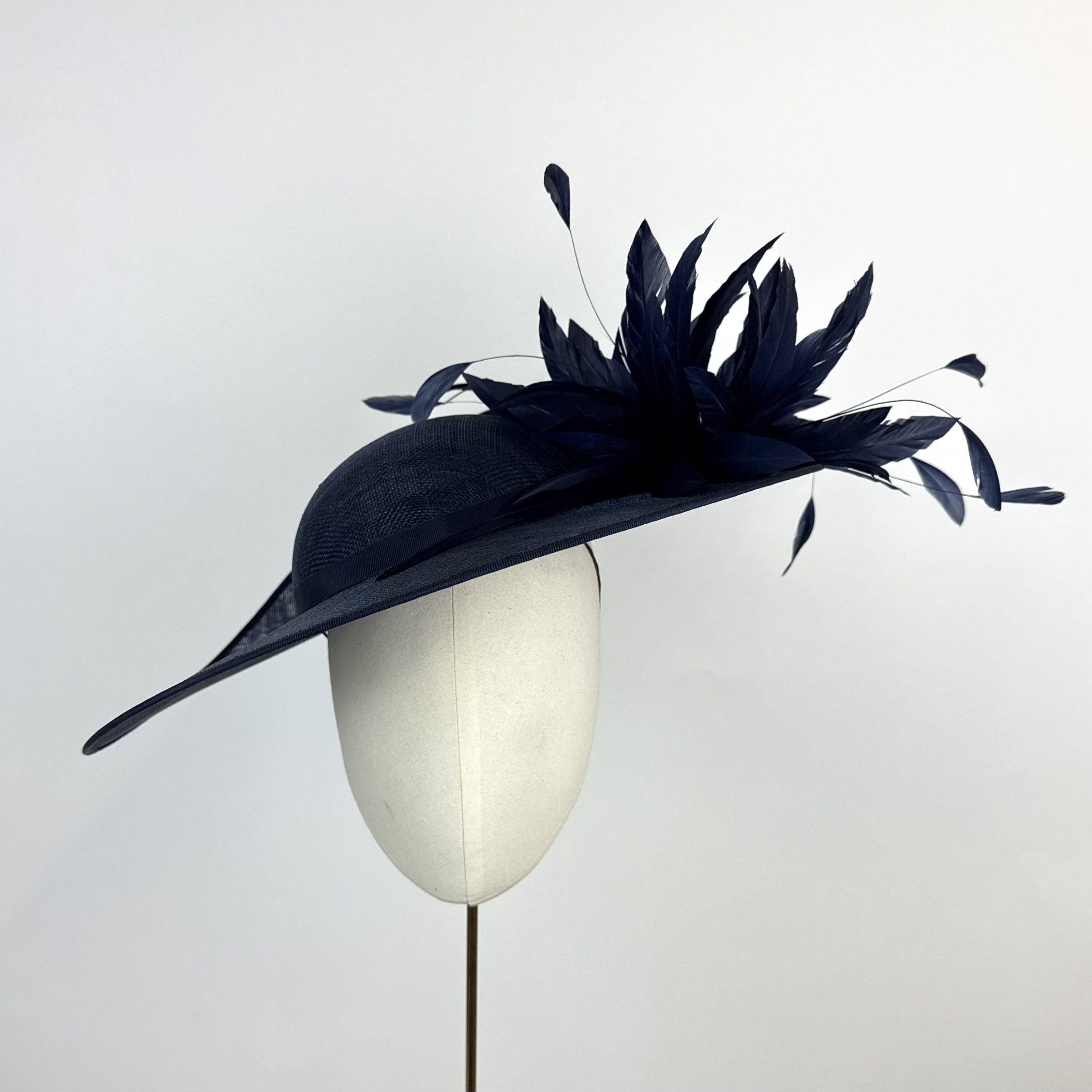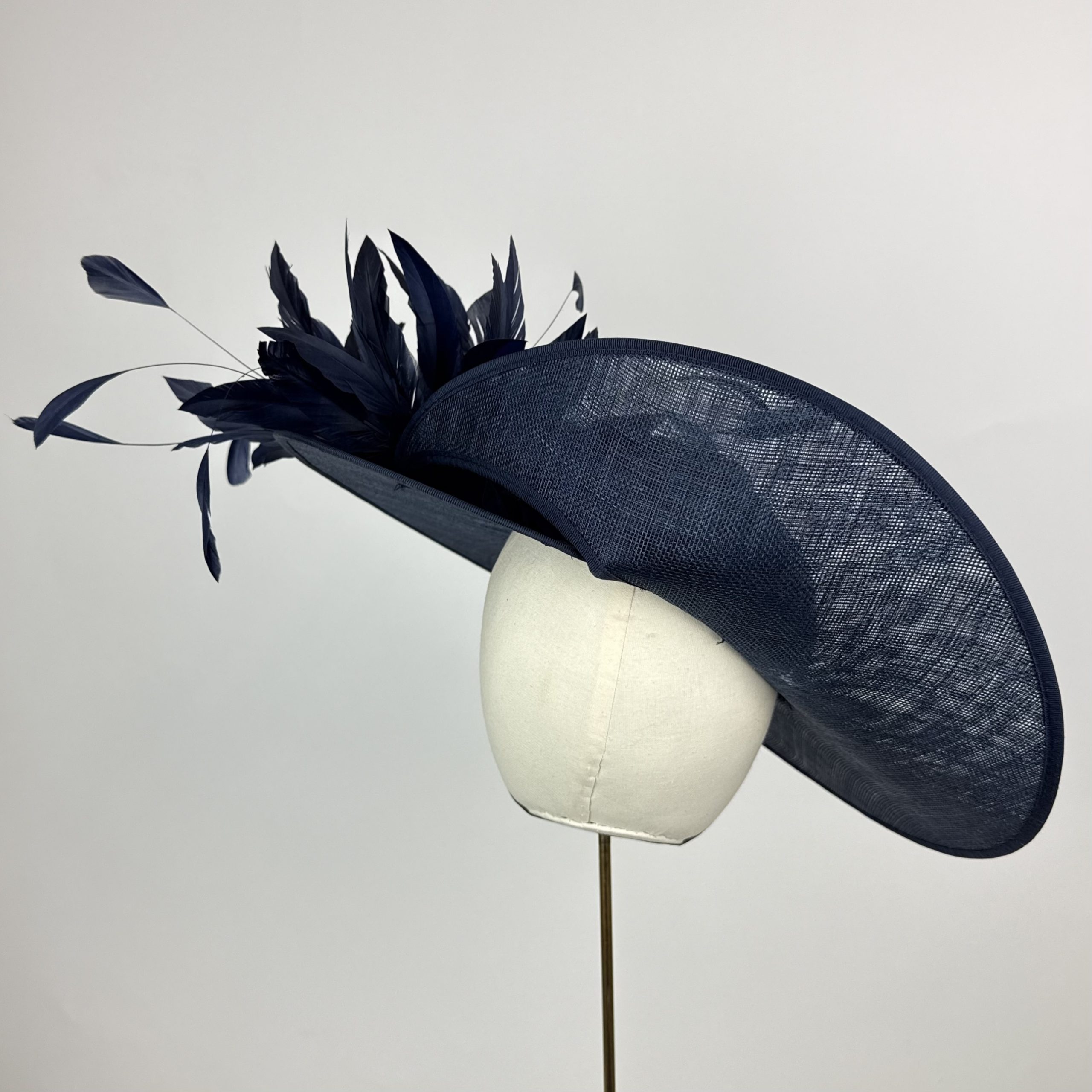 Navy sinamay hat with large rounded brim with a twisted split at the back, creating a striking structure, with a shallow crown. Finished with a navy feather explosion.