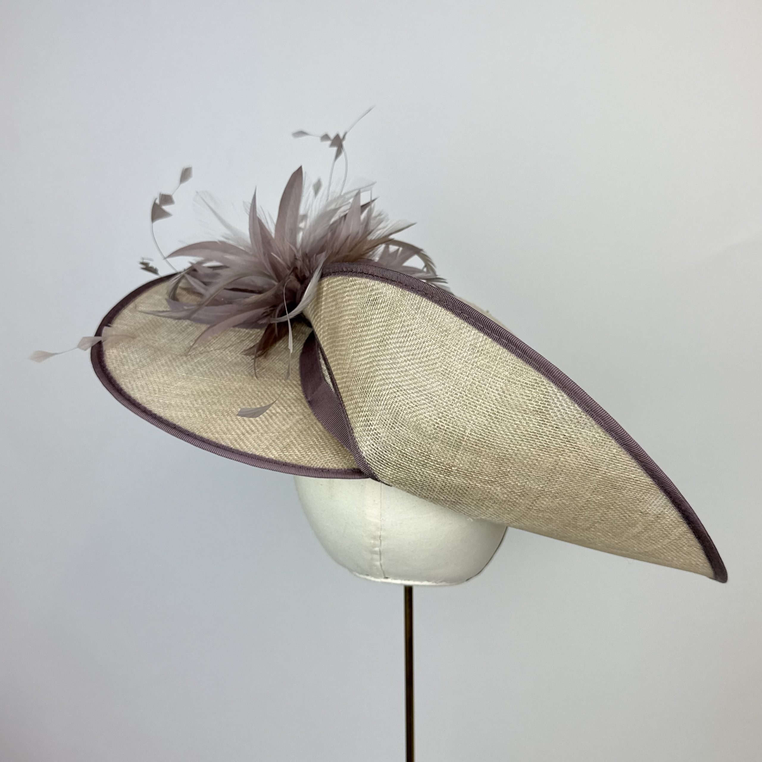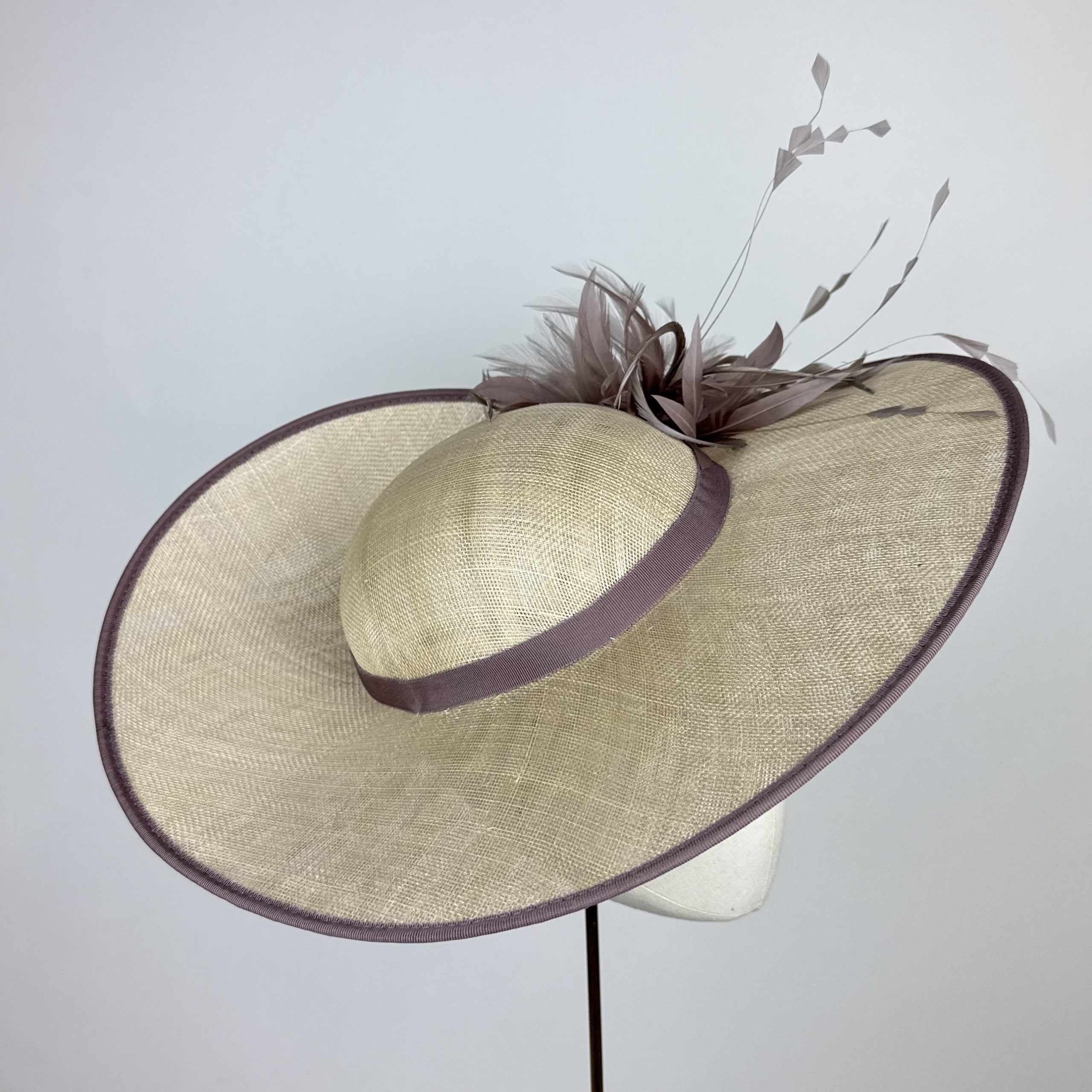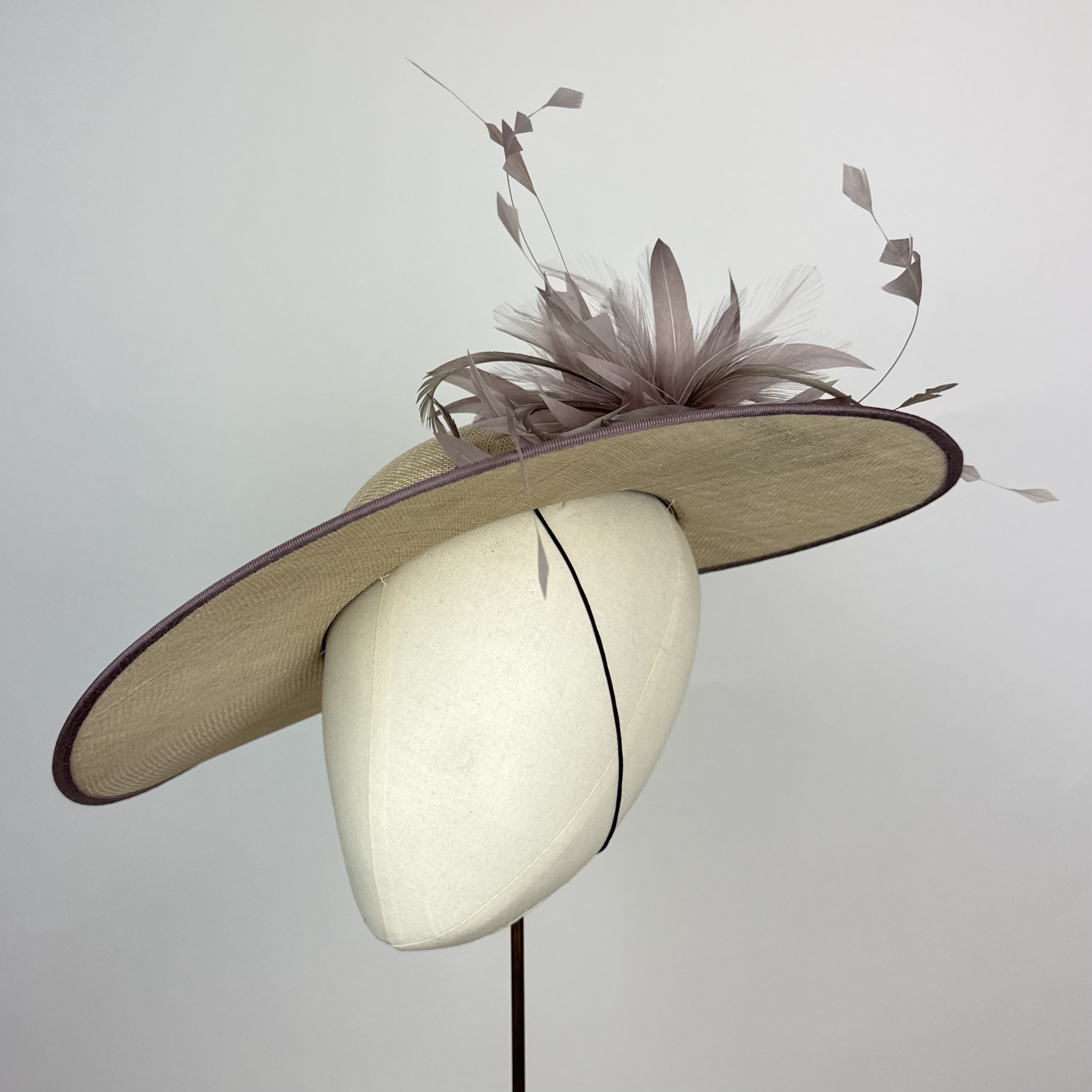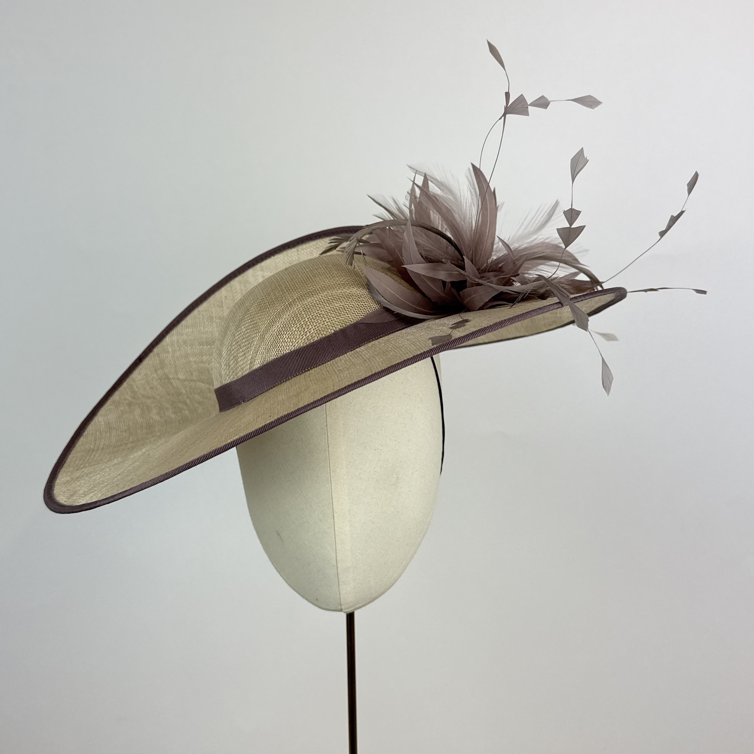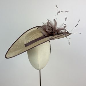 oyster sinamay hat with large rounded brim with a twisted split at the back, creating a striking structure, with a shallow crown edged in taupe. Finished with a taupe feather explosion.