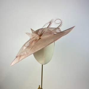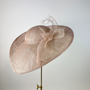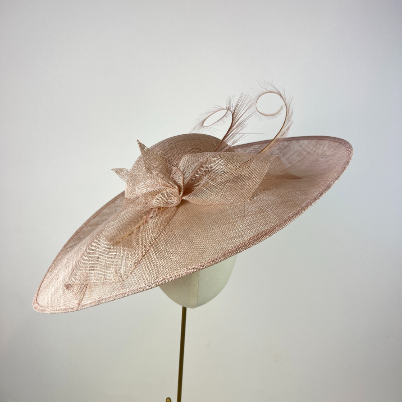 Pale blush pink oval brimmed classic hat with shallow dome crown, trimmed with an oversized blush abstract bow in Jinsin