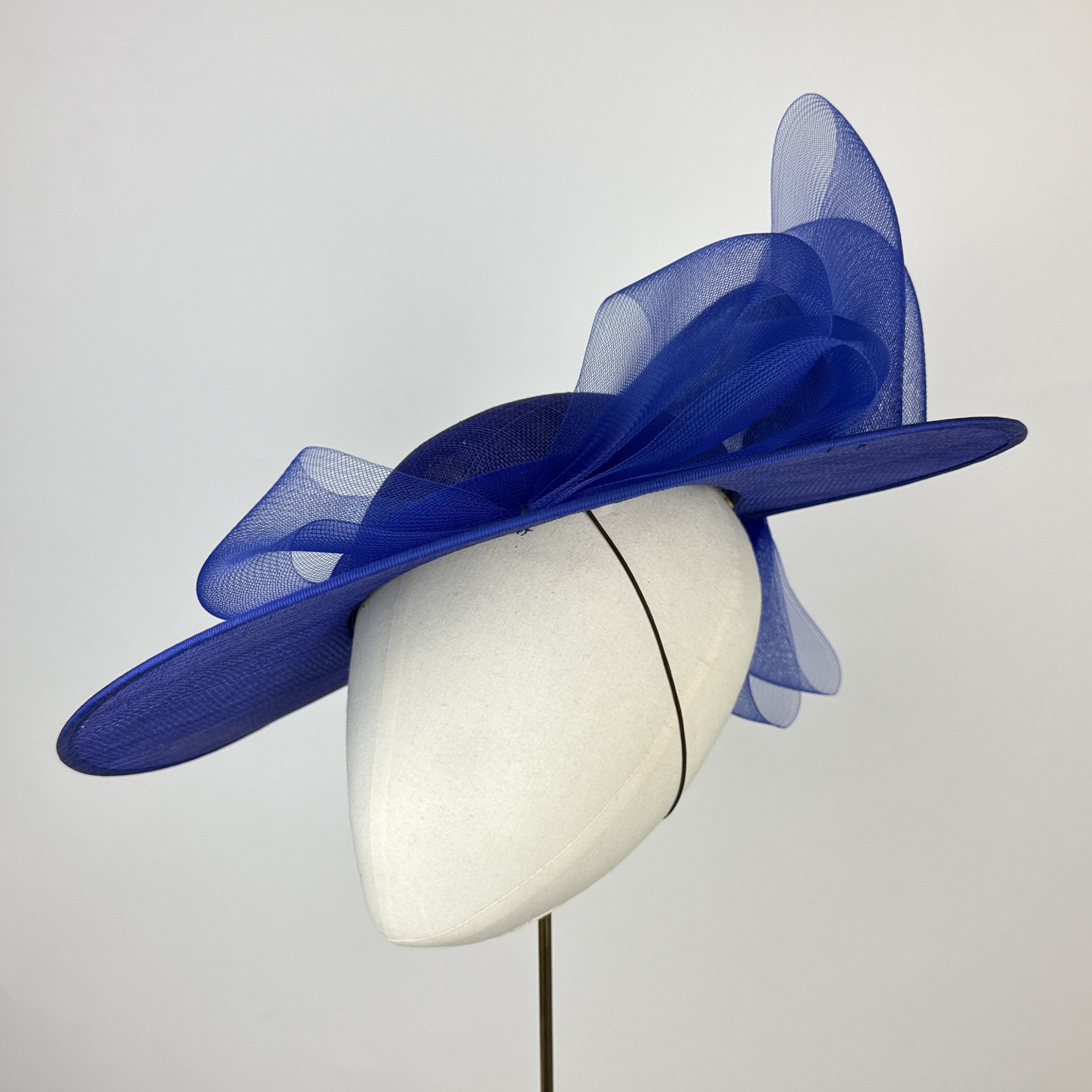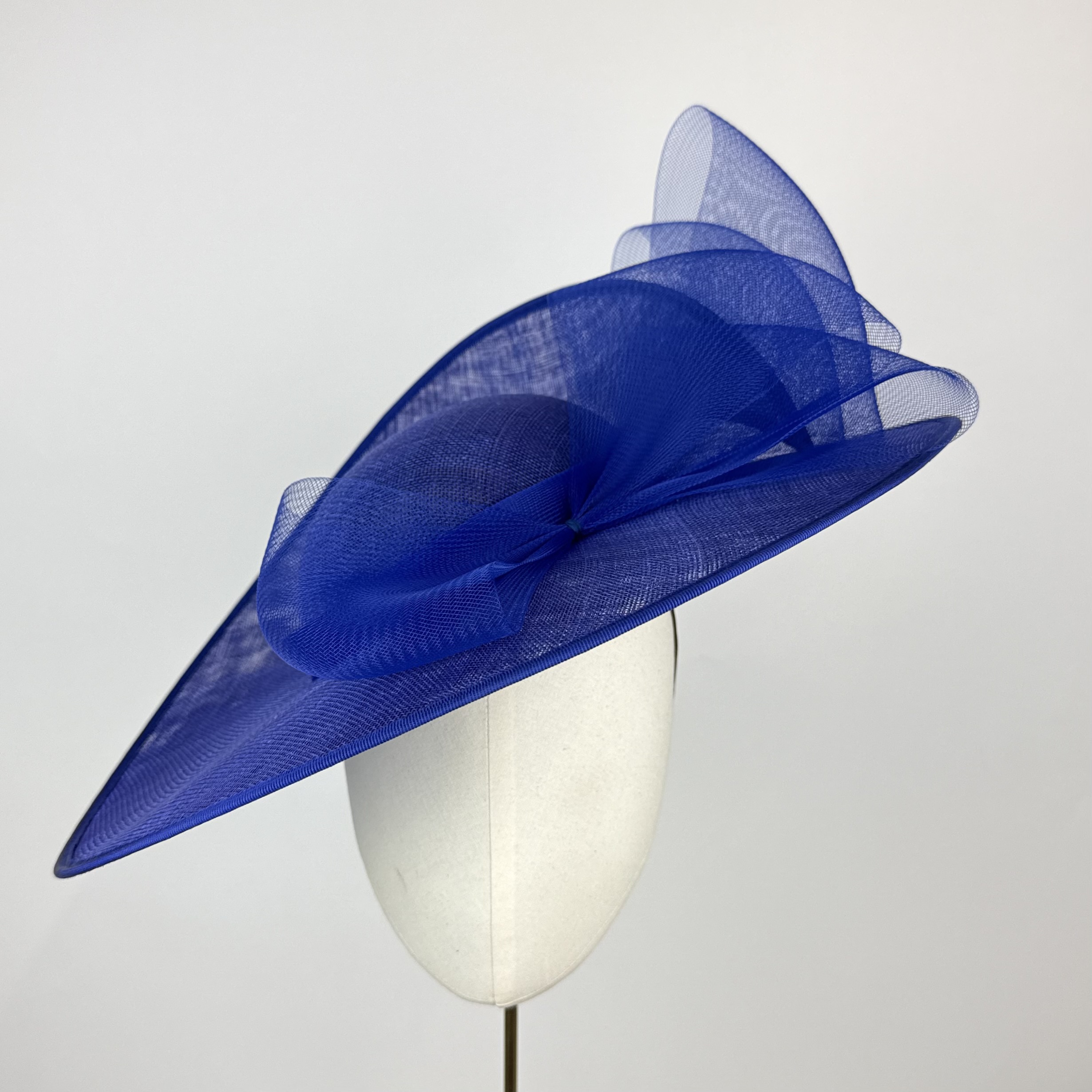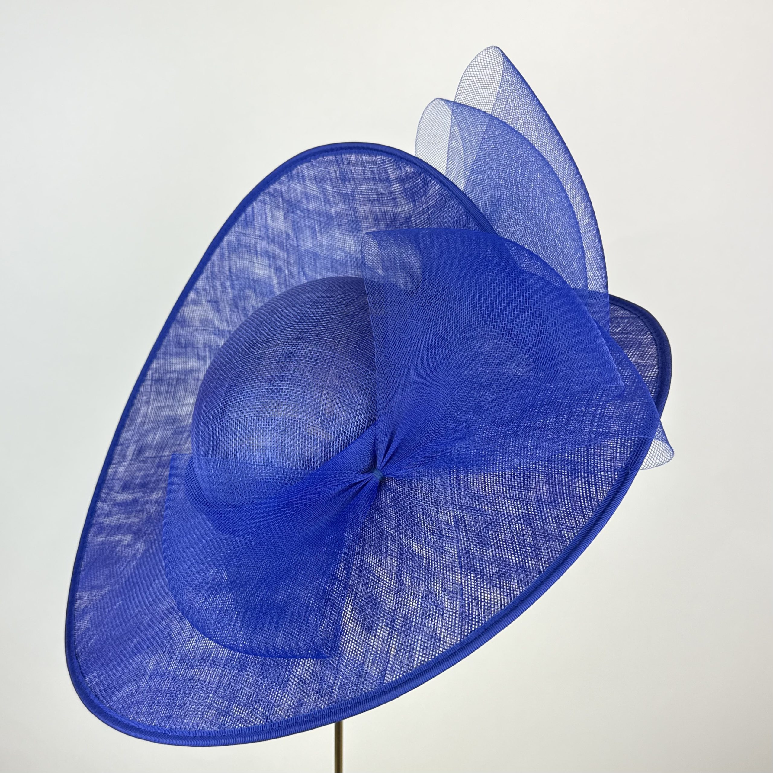Royal blue sinamay hat with large rounded brim with a twisted split at the back, creating a striking structure, with a shallow crown. Finished with a sheer royal blue angled crinoline bow at the back and on the front.