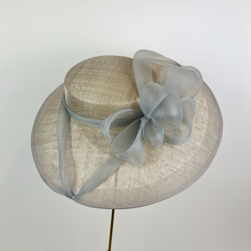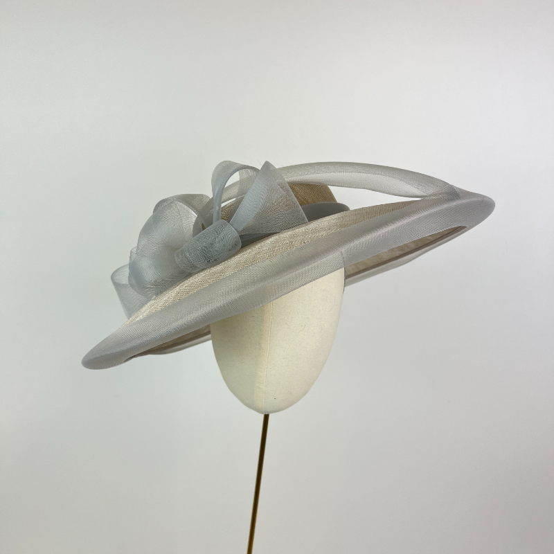 One of our most popular shaped hats, oval slightly down turned brim with shallow crown in a slightly warm grey tone edged with a sheer veil softening the edge in silver grey crinoline, finished with a sheer decorative detail.