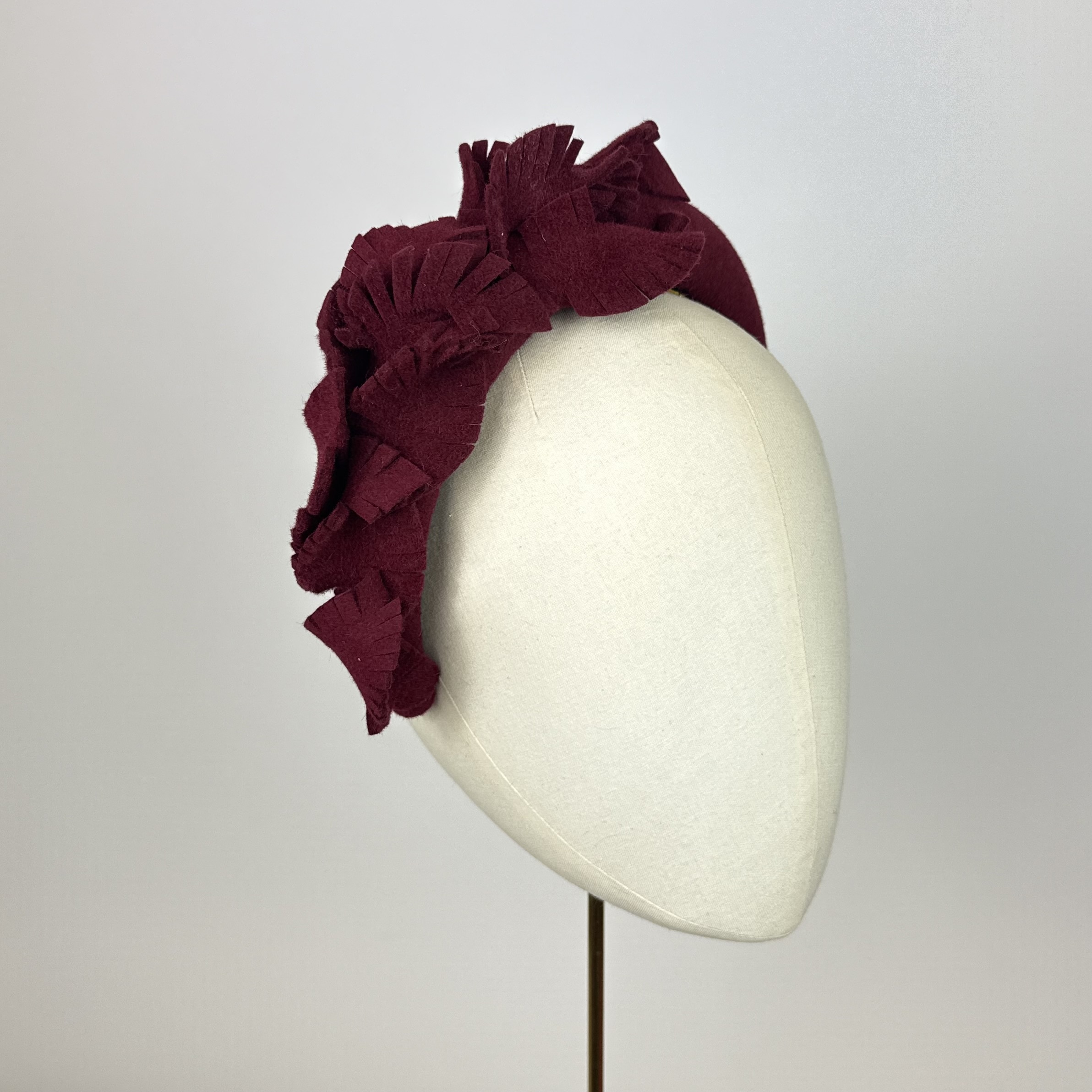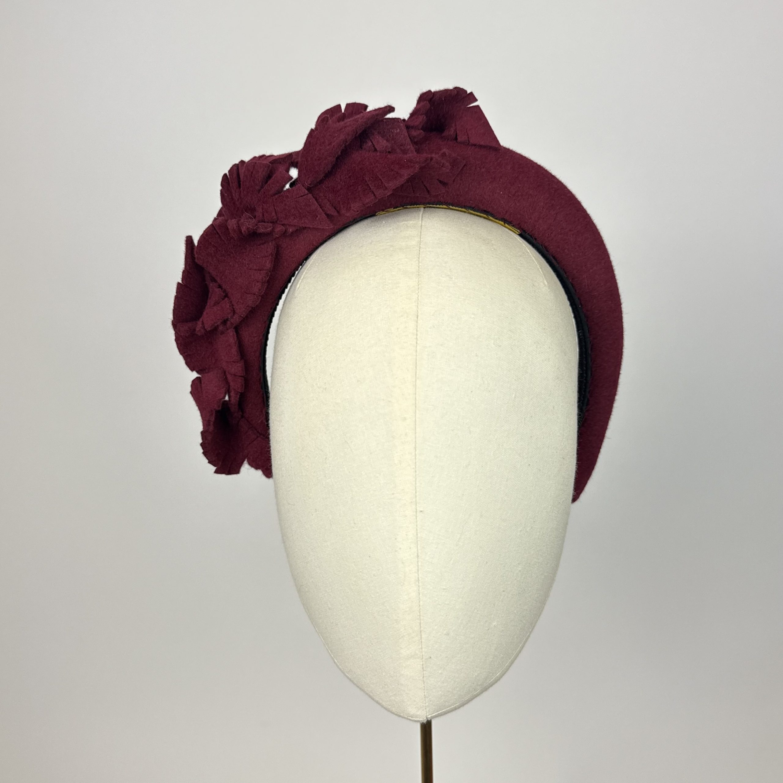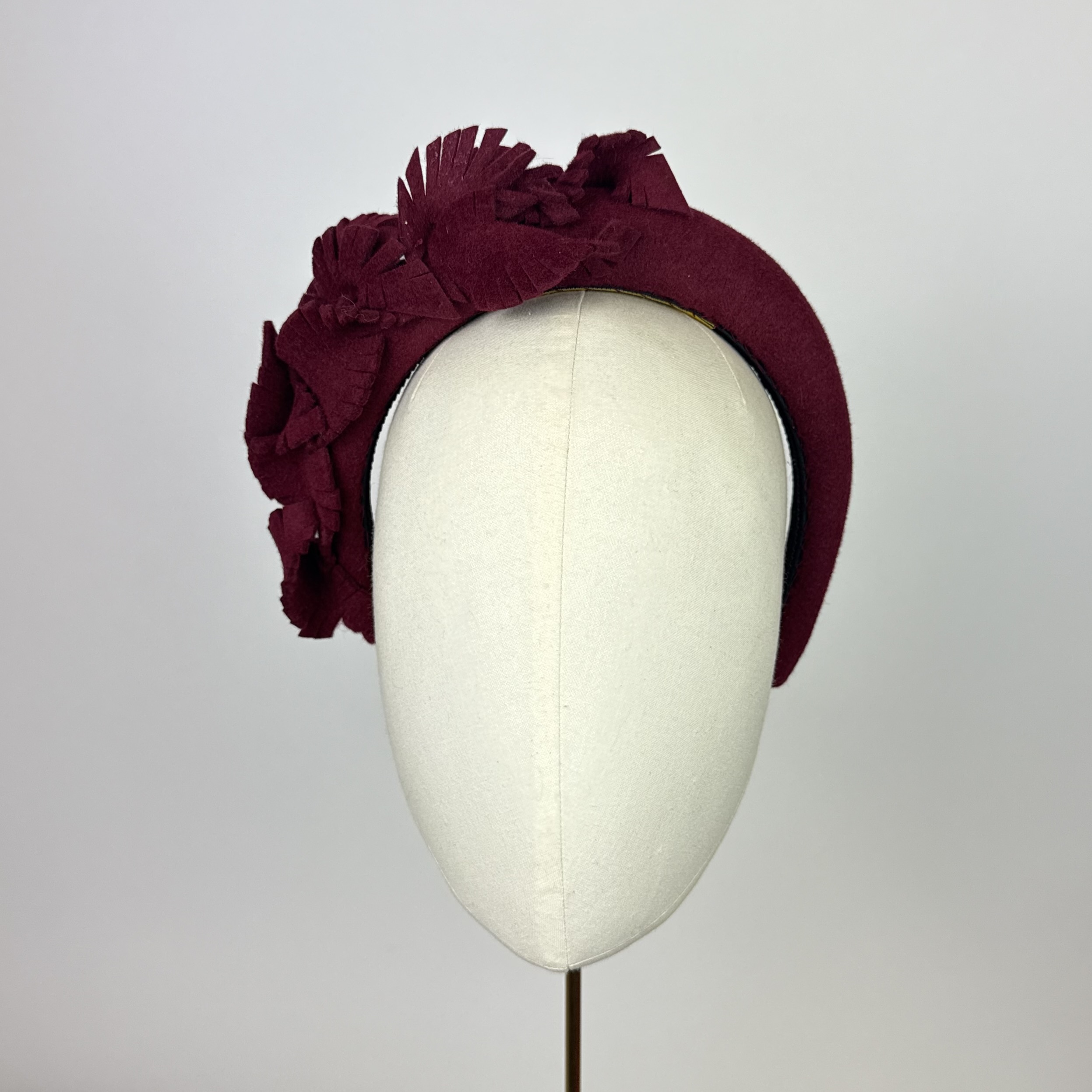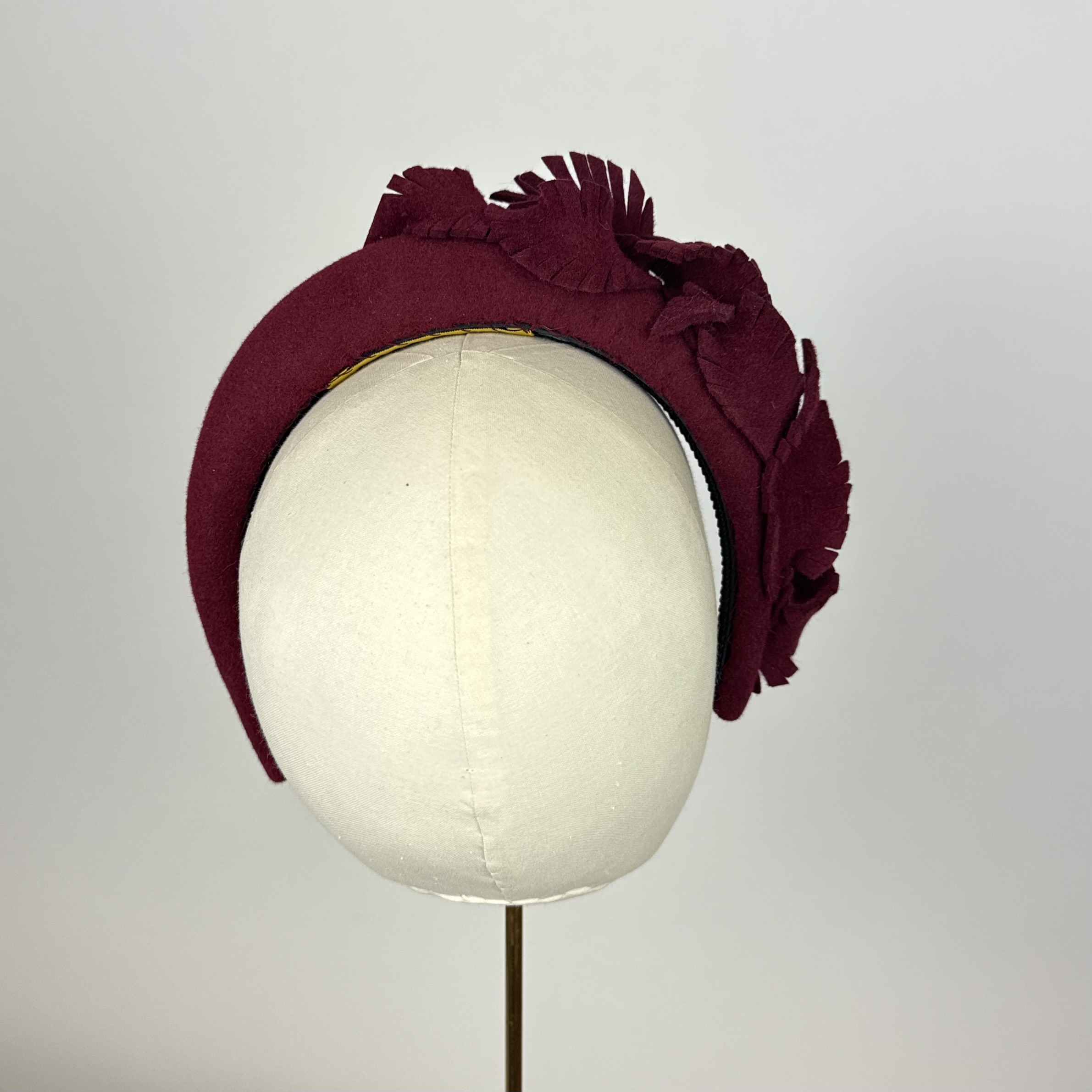 narrow low crown hairband made from cranberry peachbloom felt finished with cranberry felt feather detail
