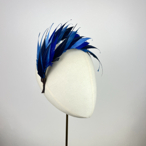 Cut feathers bound into a dramatic headpiece, theĀ two rows of feathers are malleable so can be moved to sit comfortably in the hair and create the look that you want. In a mixture of blue shades.
