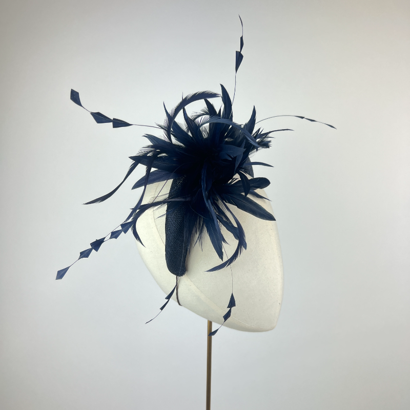 Classic sinamay crown band in navy blue finished with an explosion of cut and shaped feathers.