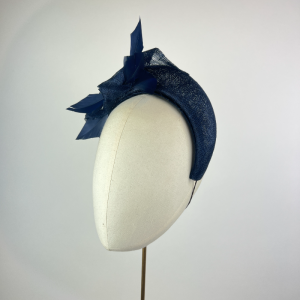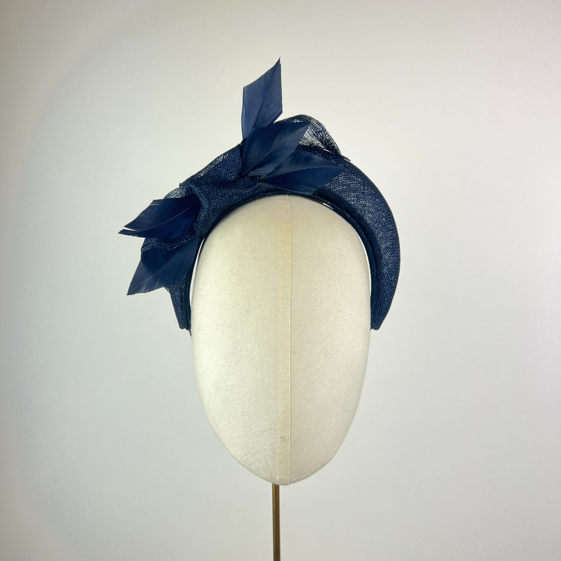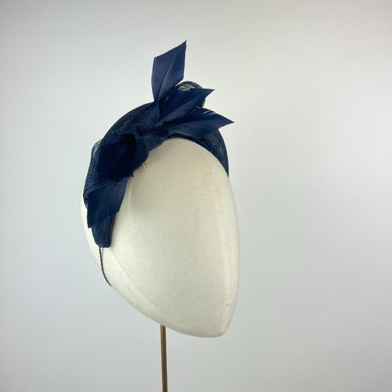 Navy blue sinamay crown band with a knot detail and feathers.