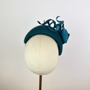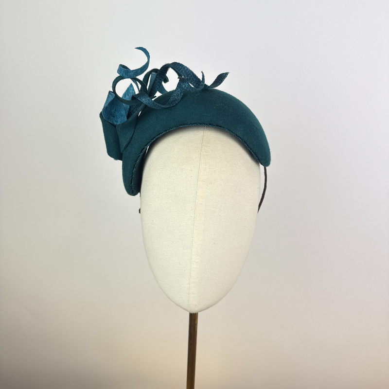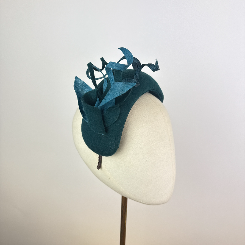 Low crown band made in teal wool felt, trimmed with felt, sinamay and compressed sinamay swirls and leaves.