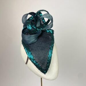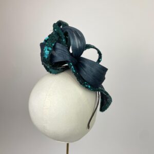 Bottle Green sinamay wave headpiece, edged in bottle green sequins trimmed with bottle green silk abacca and sequin twists delicately wrapping the shape.