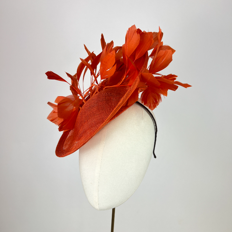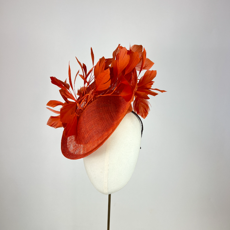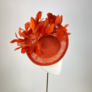 burnt orange small oval saucer hat with feathers, mother of the bride, weddingBurnt Orange Feathered Oval Saucer