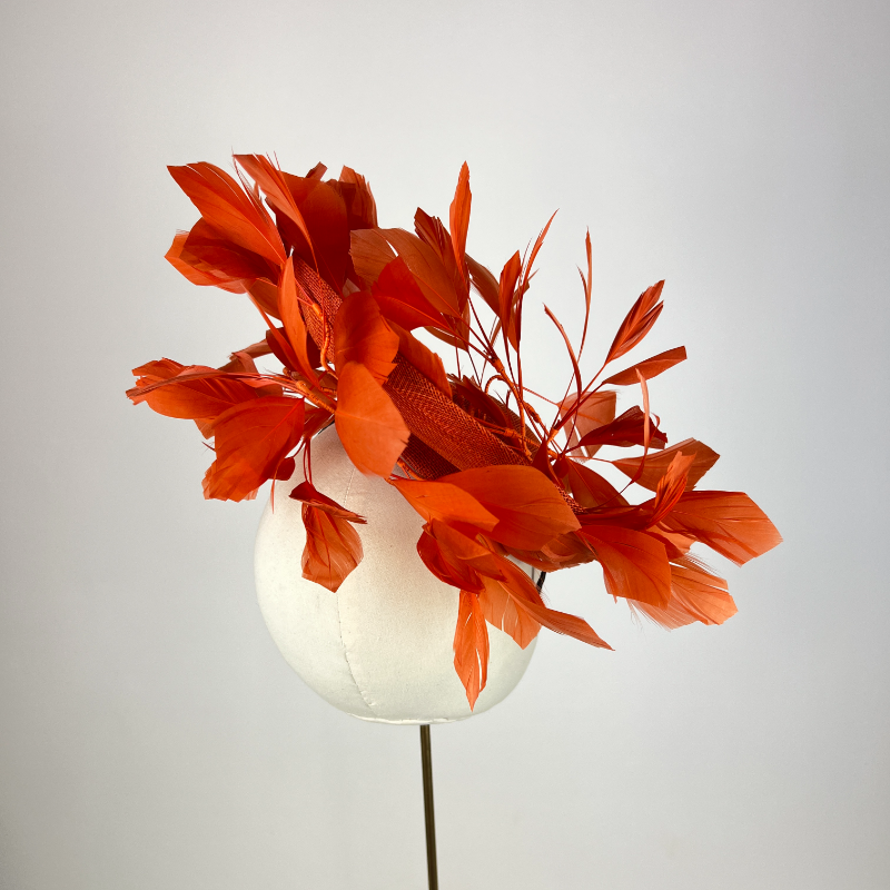 Small oval saucer hat in burnt orange with cut burnt orange feather vines on the topside and underside.