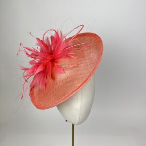 Medium sized saucer hat in coral sinamay finished with a coral feather explosion and stripped ostrich quill