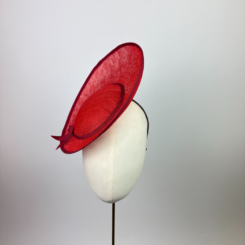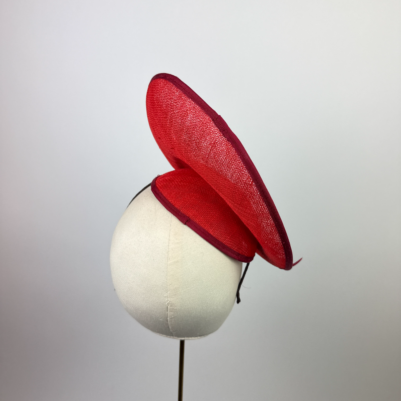 Red sinamay small oval saucer hat edged with a deeper red trim, clean and minimalist in style.