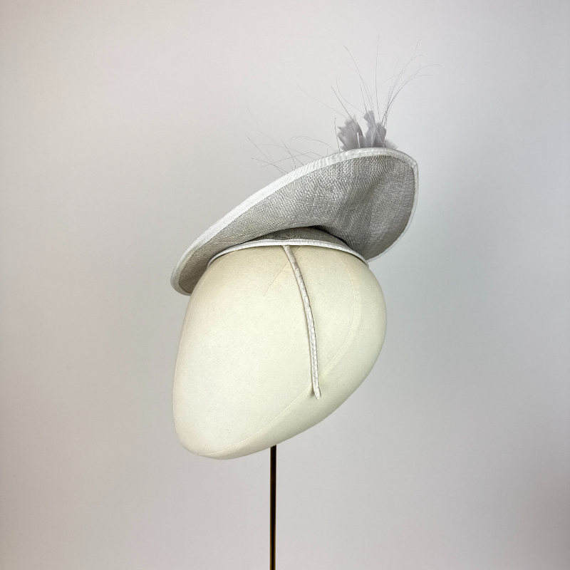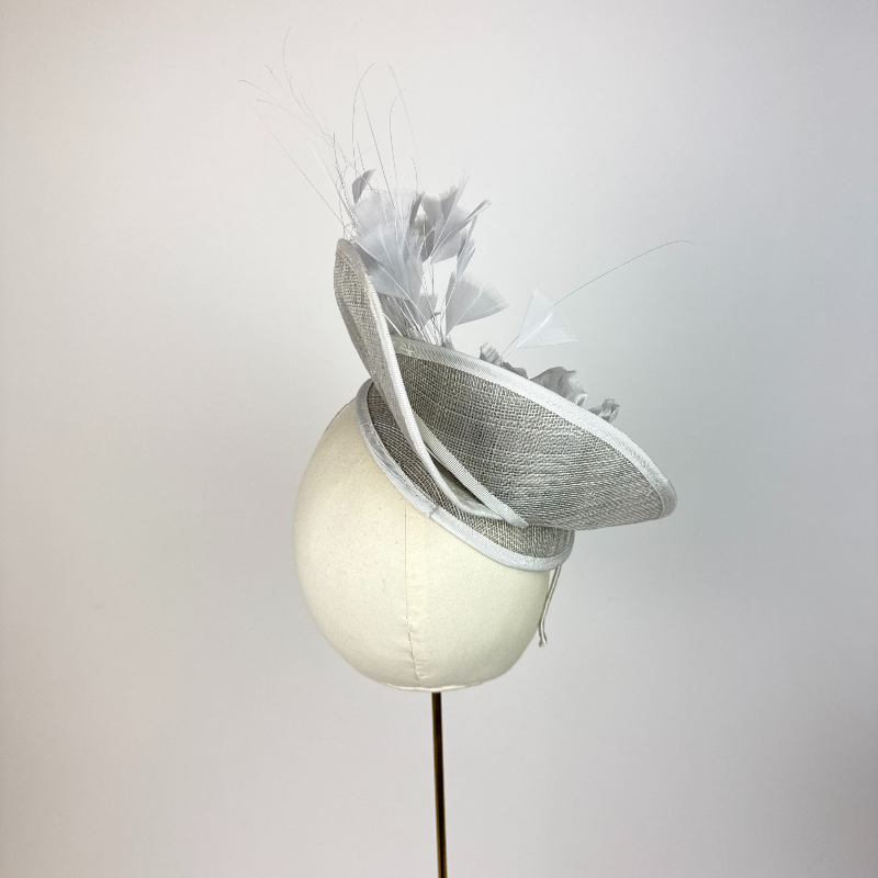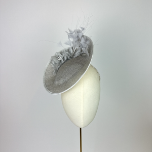 Silver grey small sinamay saucer hat with twisted split at the back, edged with soft silver grey petersham trimmed with a delicate silver grey flower spray and cut dandelion style feathers.