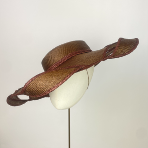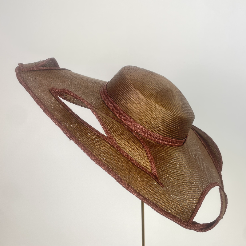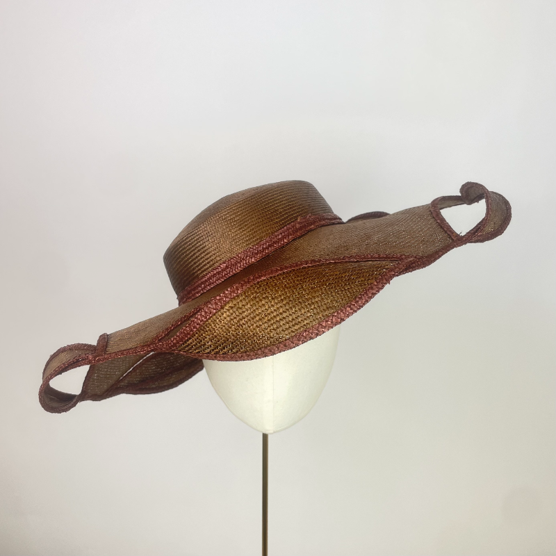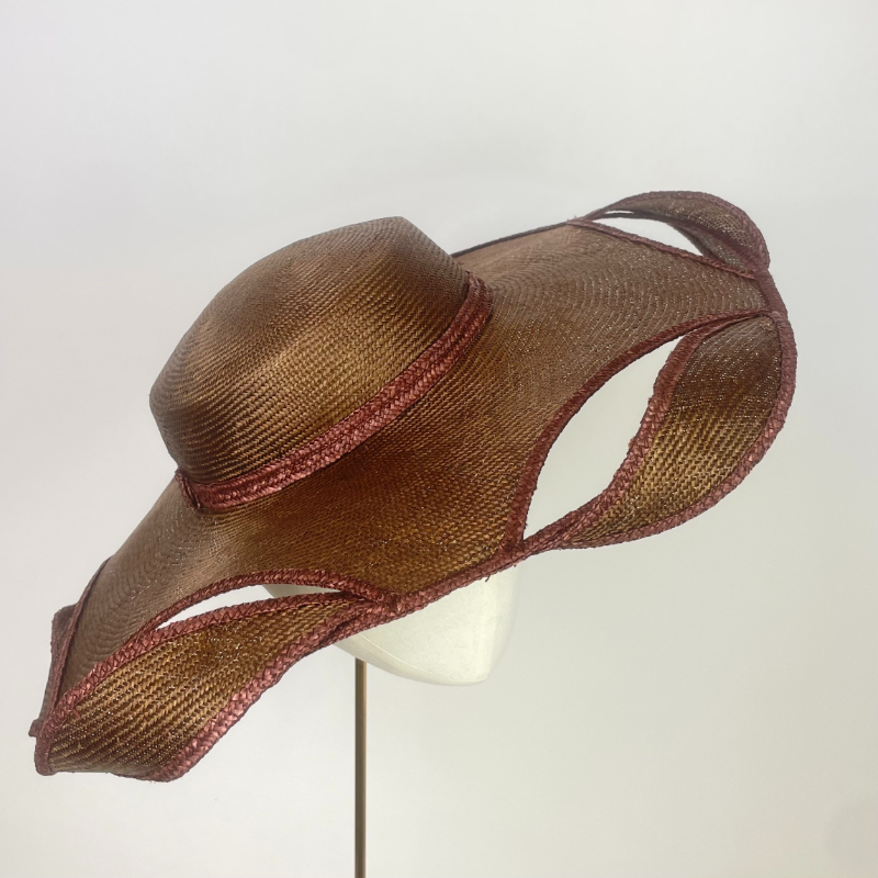 A wide sized gently downturned brim with shallow pillbox crown made from copper brown parasisal straw, edged with Brown plated straw braid, with cut out pieces around the brim allowing for twists or braid edged parasisal leaves to be woven through, creating a unique 3 dimensional finish.