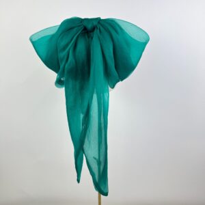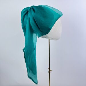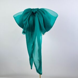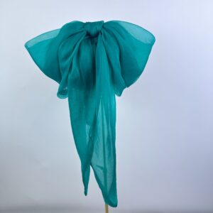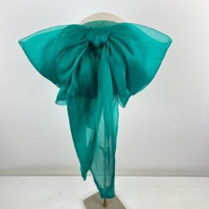 Bright emerald teal green calot hat with structured sinamay base, finished with a large blousy sheer silk bow and tails