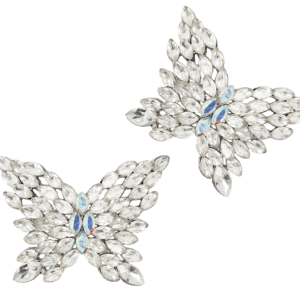 A pair of butterfly shaped set clear crystal shoe clips that can be attached to the front or side of any shoes,