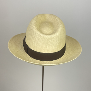 Genuine Panama hat, woven in Equador, natural straw and blocked and trimmed with a brown ribbon.