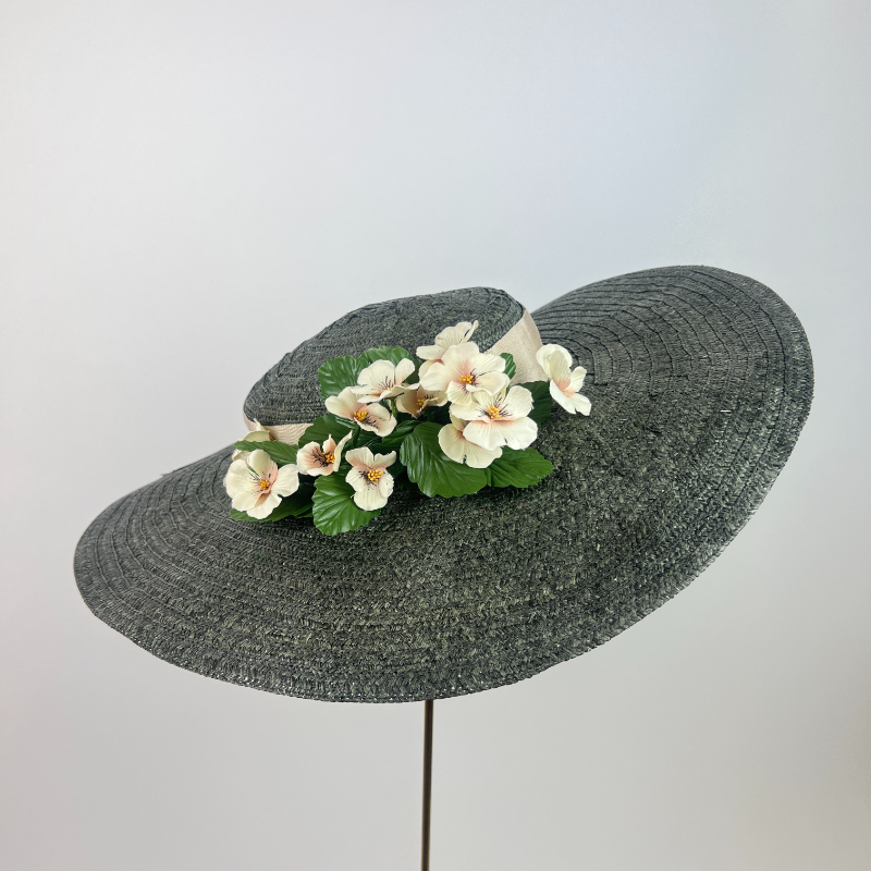 Green grey strip straw boater hat with an unwired unstructred brim and shallow crown, soft and ethereal, perfect for a garden party or summer garden wedding. trimmed with vintage silk viola flowers in cream and a cream 100% cotton hat band.